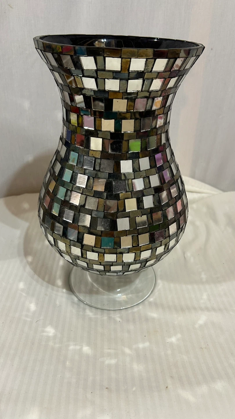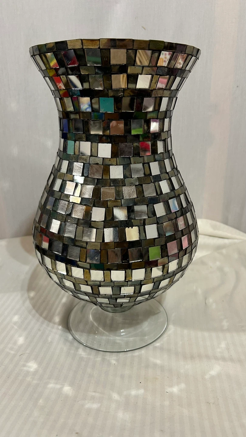 96This is a lovely mirrored mosaic vase that would look great in any home! It's in great condition and has a unique design that catches the light beautifully. The vase is approximately 12 inches tall.