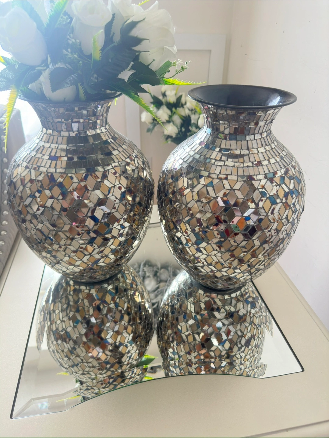 Selling a set of two mosaic mirrored vases. They're in great condition and would add a touch of sparkle to any room!
