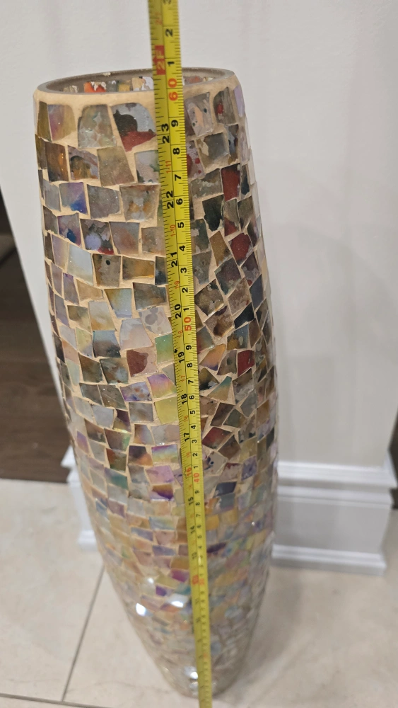 129Selling a mosaic vase, perfect for adding a touch of sparkle to any room. It stands approximately 23 inches tall. The mosaic design features a variety of iridescent colours and textures. If the ad is up, it's still available Serious inquiries only