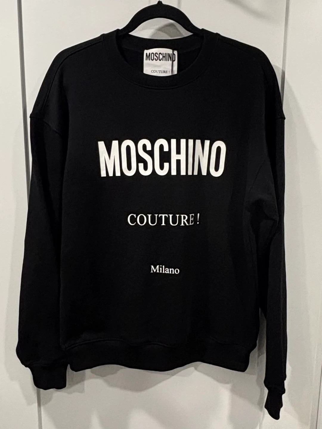 108Clean and New ! Never worn . Retail price is $750+tax Size is a 38 US which fits like a Men’s Medium or Women’s Large . Moschino Couture! sweatshirt in black. It's in new condition and made of 100% cotton. Perfect for adding a touch of designer style to your wardrobe!
