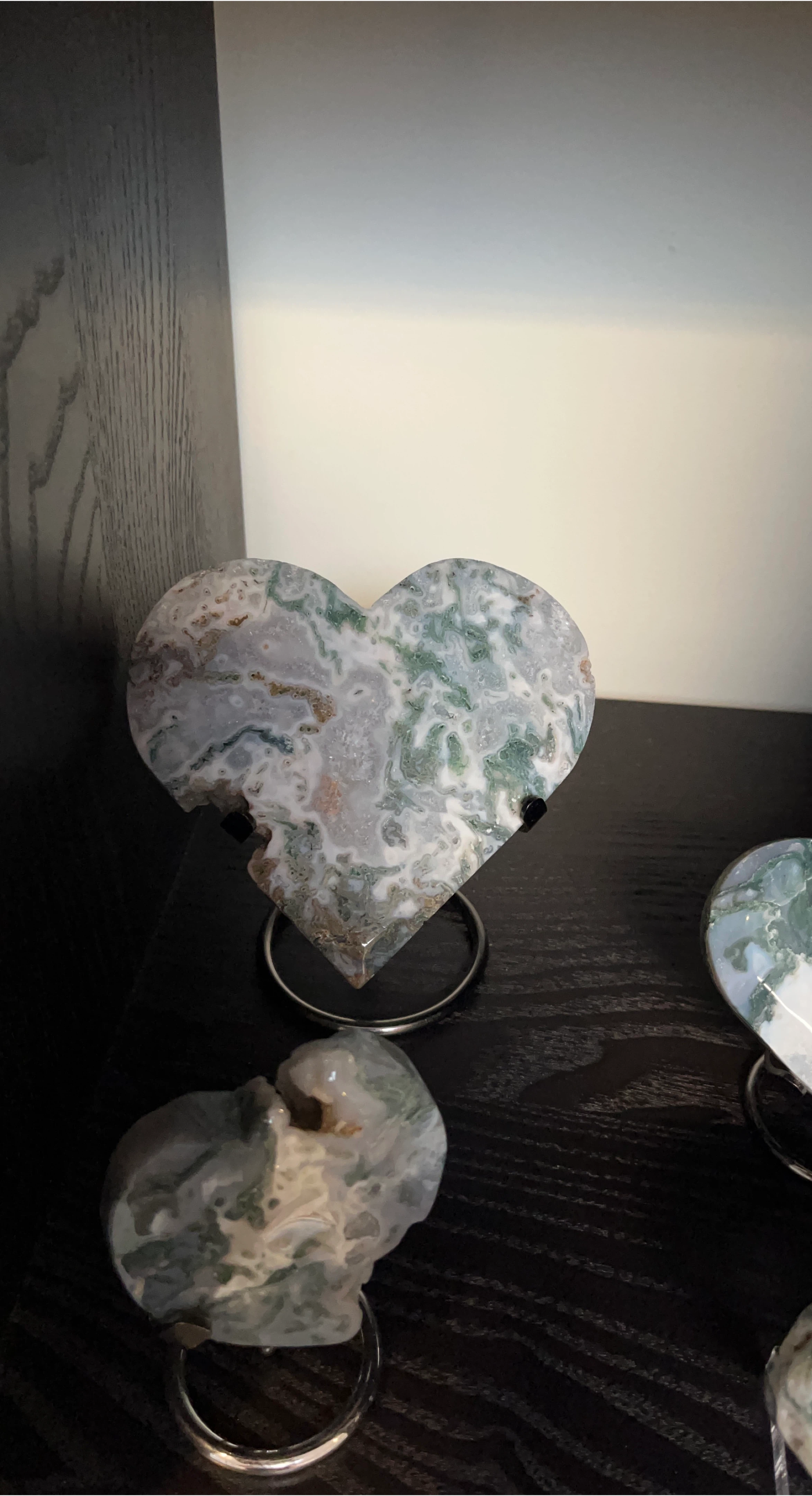 Selling a beautiful moss agate heart stone displayed on a metal stand. The stone has a lovely mix of green, grey, and white patterns. It's a unique piece that would look great in any home!