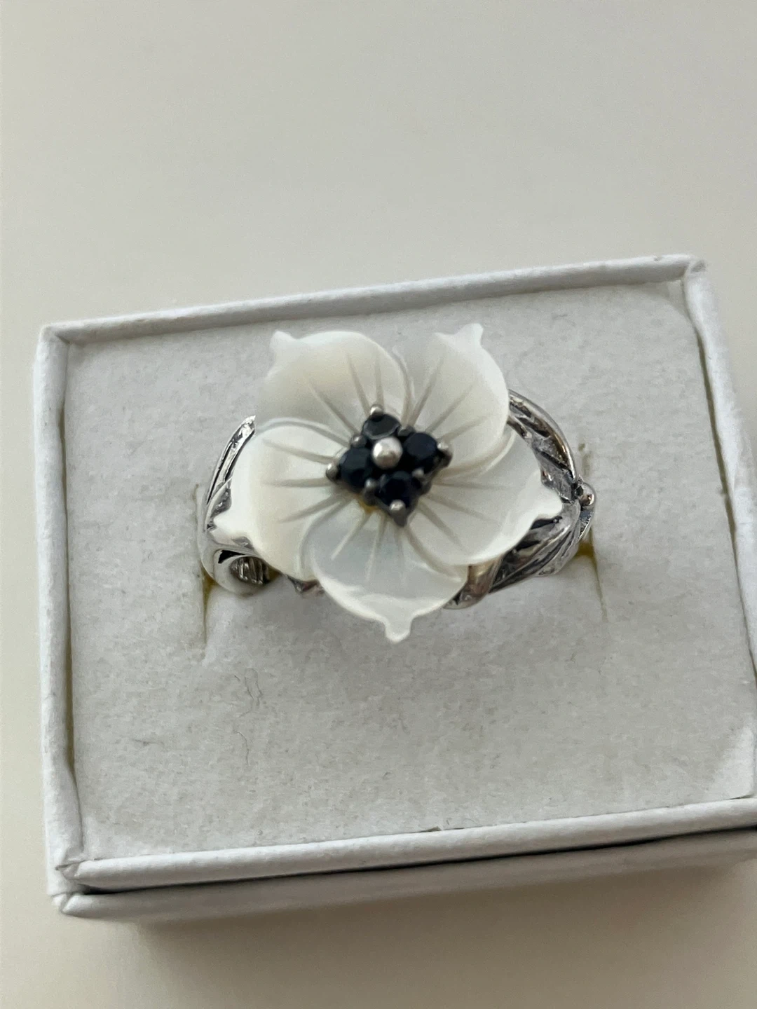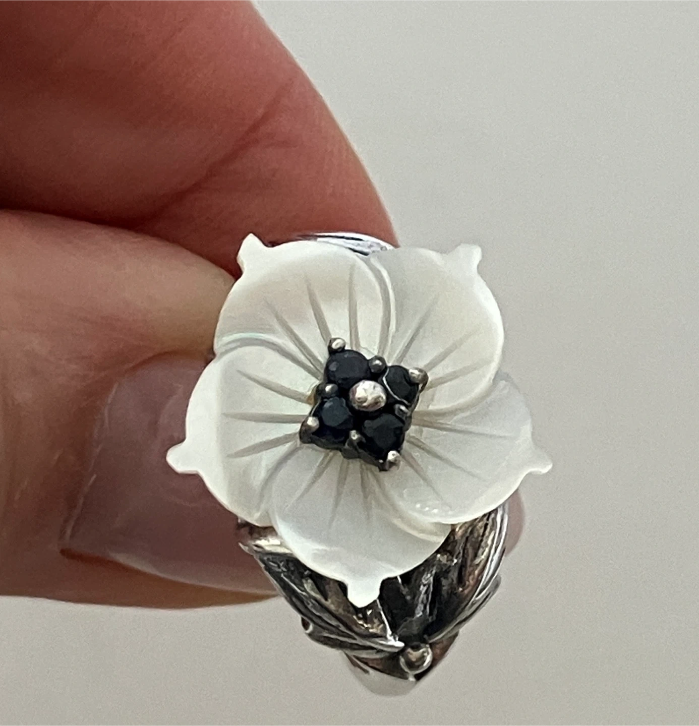 18Beautiful sterling silver ring featuring a delicate flower design. The flower has a white, mother-of-pearl-like appearance with a dark stone at the center. The band has intricate leaf detailing, adding to its unique charm. Perfect for adding a touch of elegance to any outfit!