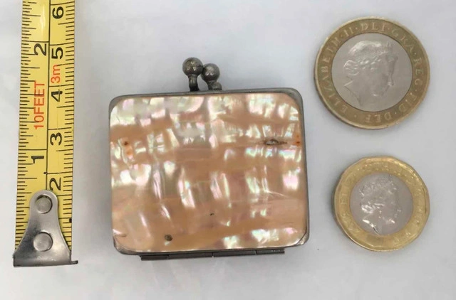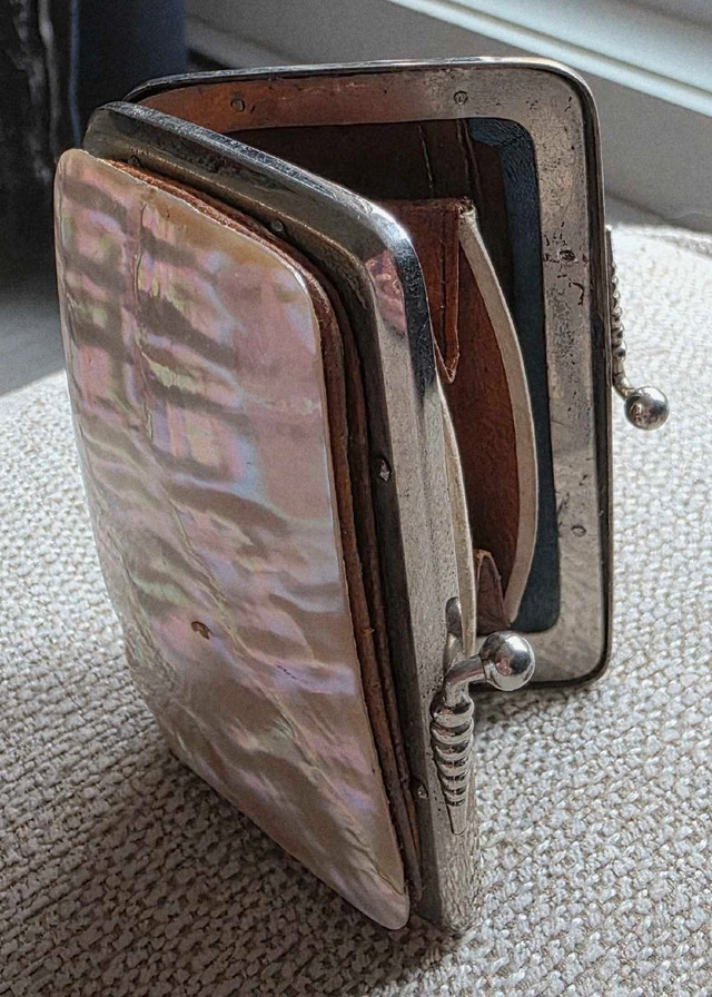 86This is a used antique Mother of Pearl coin purse with a metal frame, perfect for collectors or anyone who appreciates vintage accessories. The coin purse features a beautiful iridescent finish, showcasing the natural beauty of mother of pearl. The clasp and hinges are functional. Note, there is a small chip on the mother of pearl, see photos for details. If you have a soft spot for relics from bygone eras, this coin purse might just be your cup of tea! If the ad's still up, the coin purse is waiting for you! I've looked around Kijiji and similar purses tend to sell in the $50-$80 range.