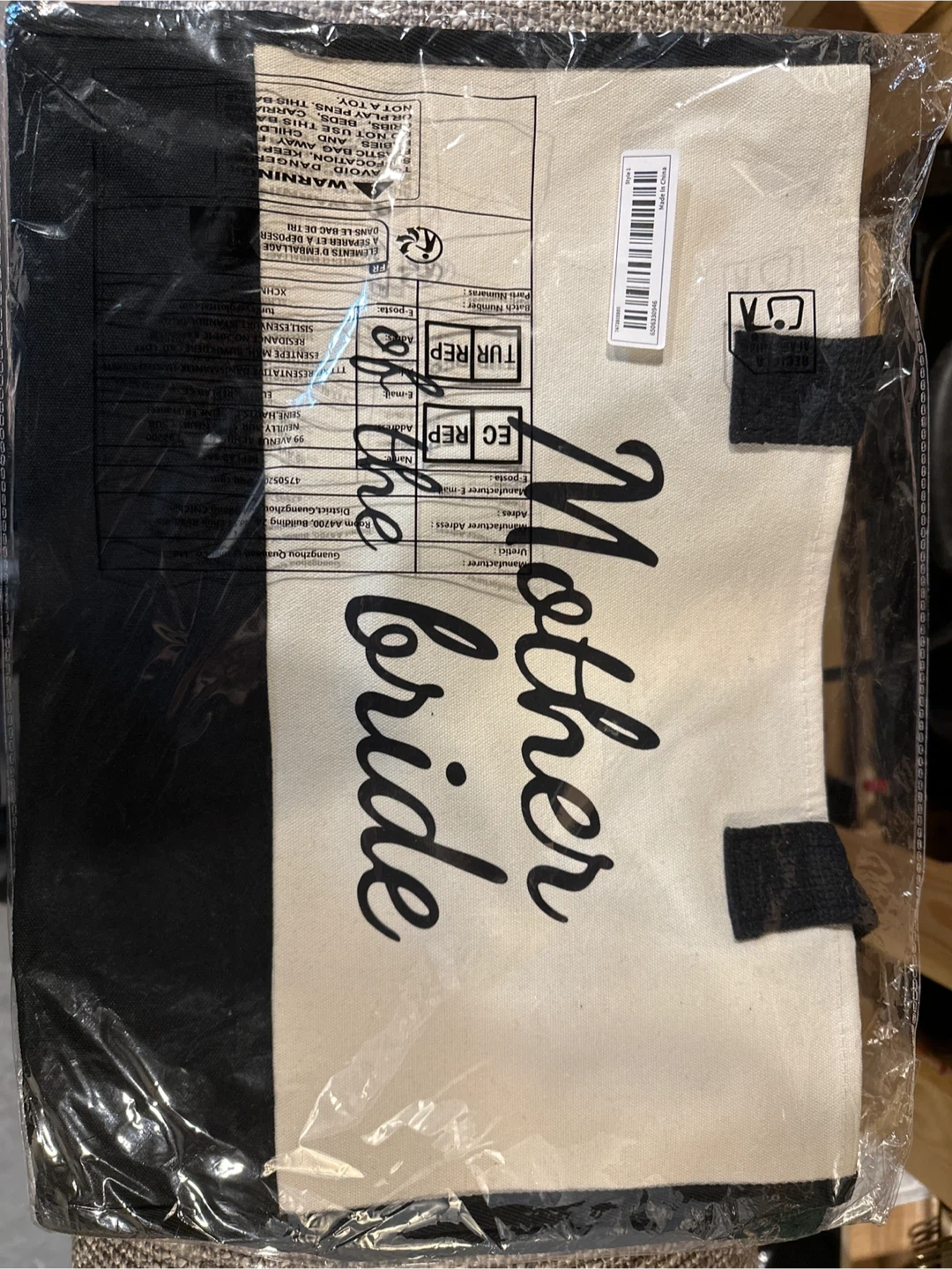 75Brand new tote bag that says "Mother of the Bride" on it. It's still in its original packaging, so it's in perfect condition!
