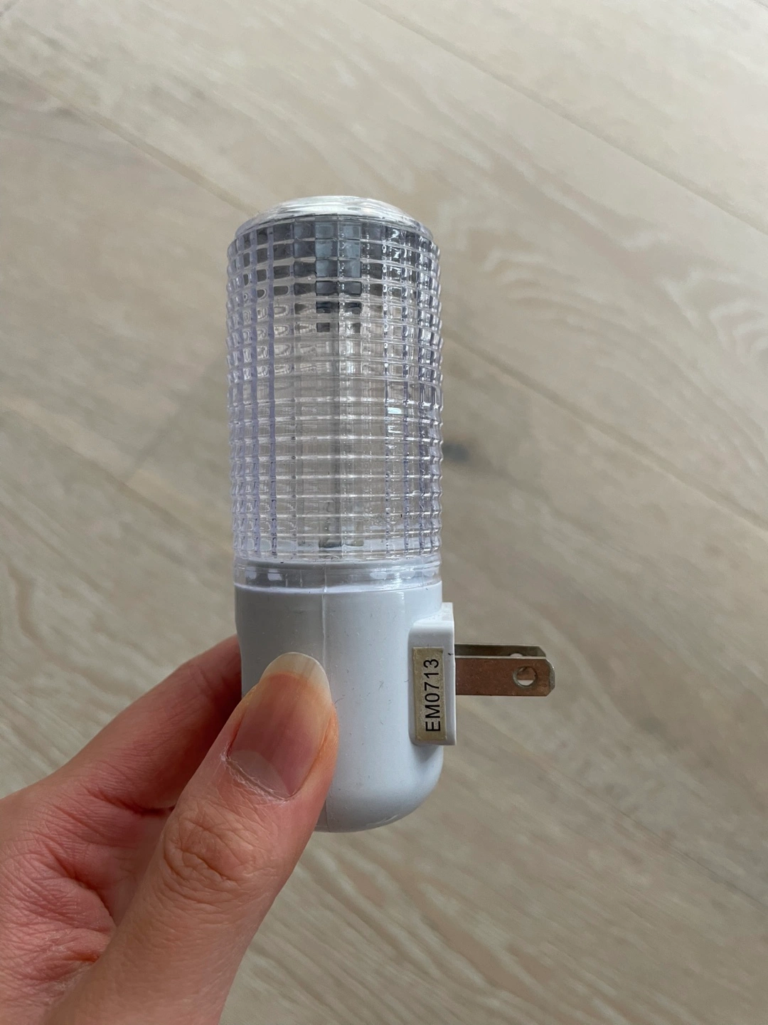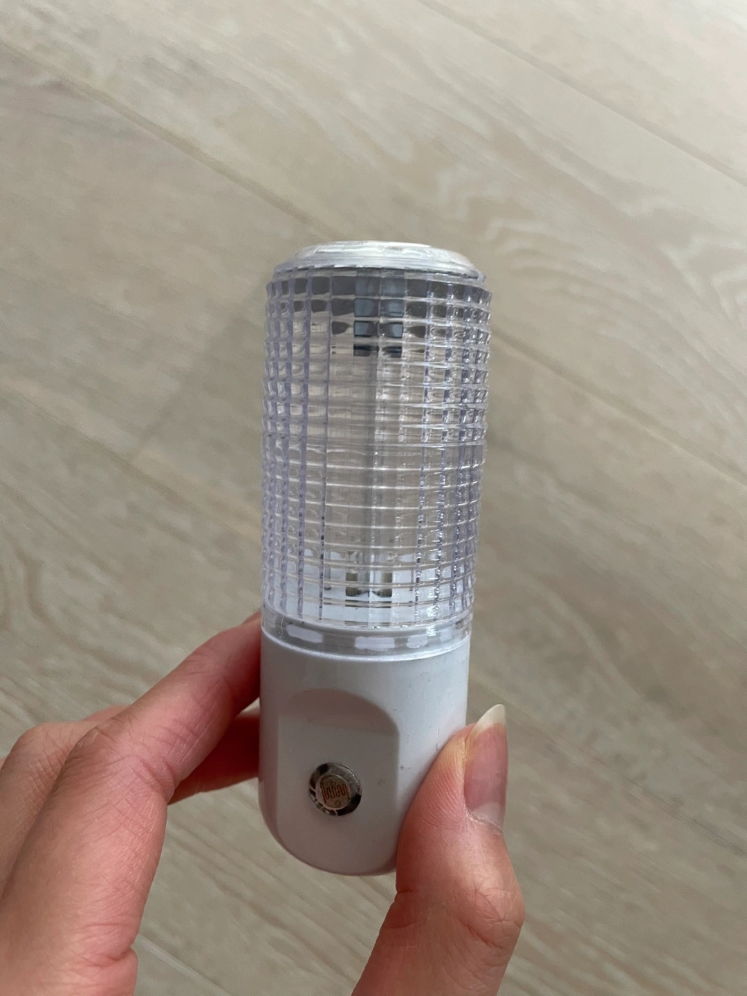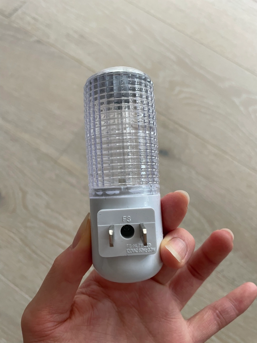10A small white motion sensor night light. It has a clear, textured cylindrical cover and a plug-in base.