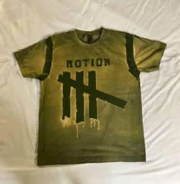 Selling an Motion T-shirt. It's a unique piece with the word 'MOTION' printed on the front and a cool design on the back. Great for casual wear or as a statement piece!