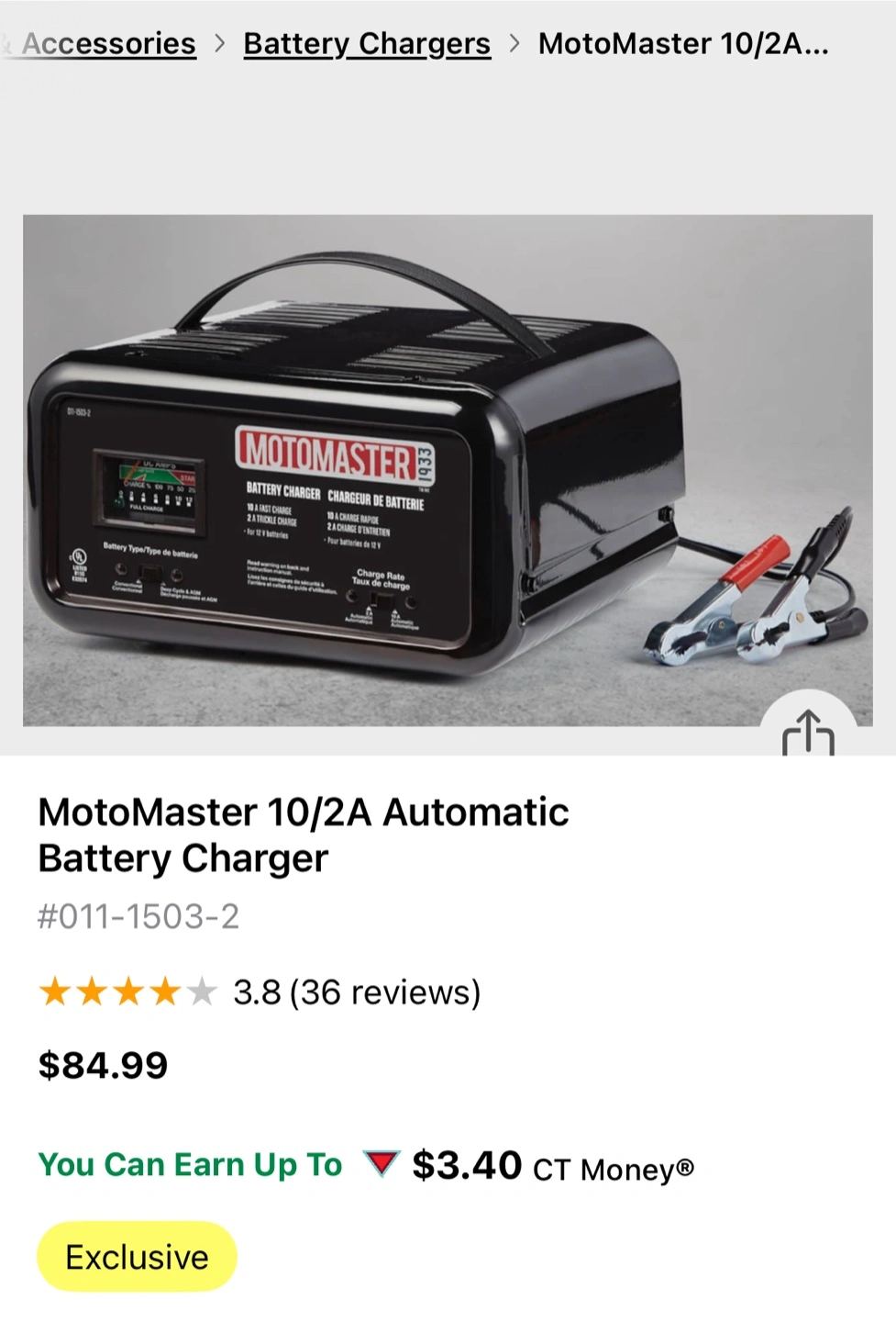 355Canadian Tire - MotoMaster 10/2amp - 12volt Automatic and Manual Battery Charger. Great if you have a weak battery. Can recharge fast or slow and trickle charge when battery is sitting long time or if you need a fast charge. If item is still here, it’s still available. First come first served or whoever pays first. I accept etransfers as well and live near CN Tower. I do deliver as well! Check out other items seller has. Always adding new items!! Keep checking back!!!