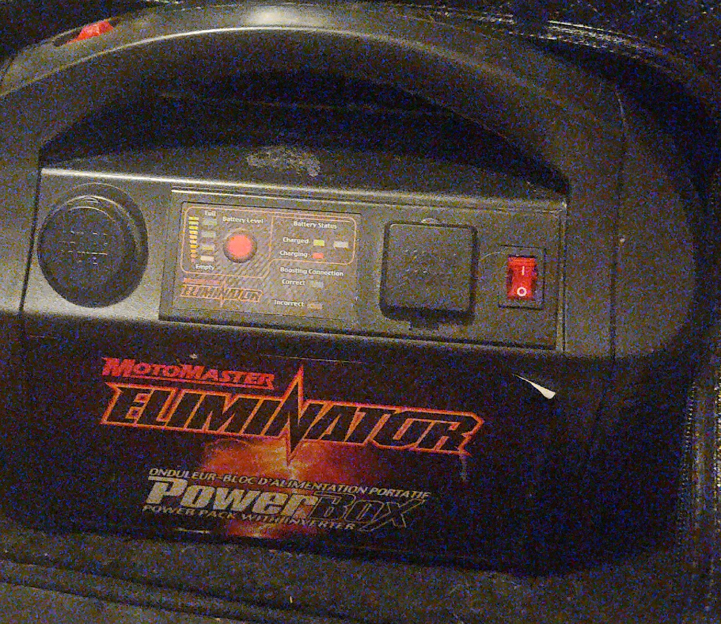 Selling a MotoMaster Eliminator Power Box. It features battery level and status indicators, including charged, charging, boosting connection, correct, and incorrect indicators. It also has a power pack with an inverter.