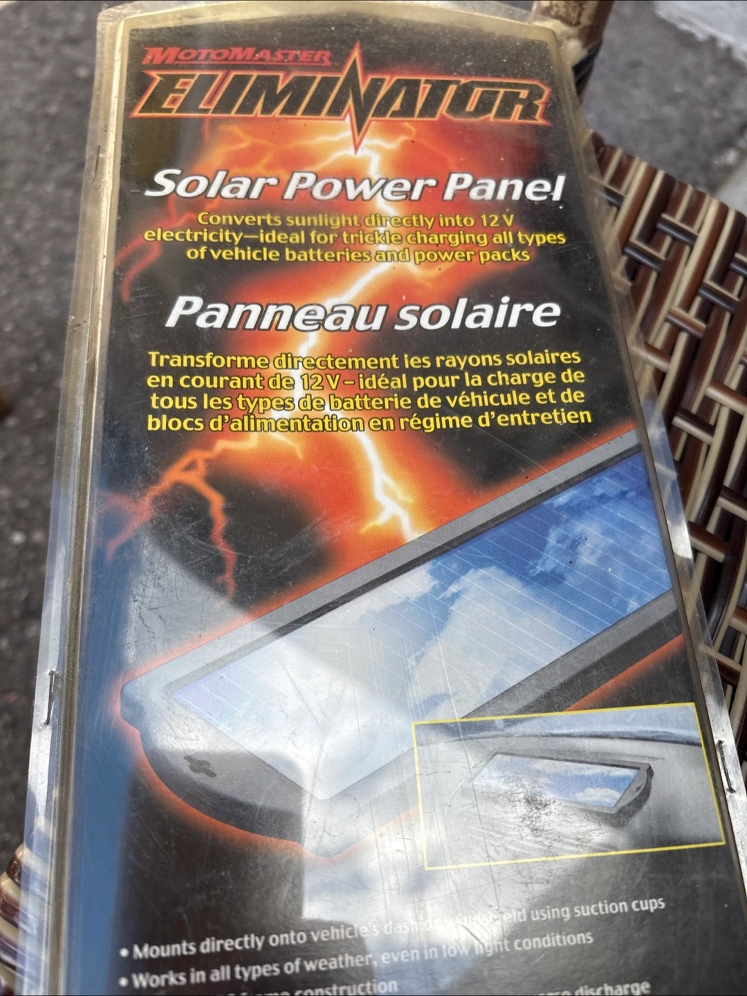 I'm selling a MotoMaster Eliminator Solar Power Panel. It converts sunlight directly into 12V electricity, making it ideal for trickle charging all types of vehicle batteries and power packs. It mounts directly onto a vehicle's dash or windshield using suction cups and works in all types of weather, even in low light conditions. It also has a built-in blocking diode that protects the battery from reverse discharge $20