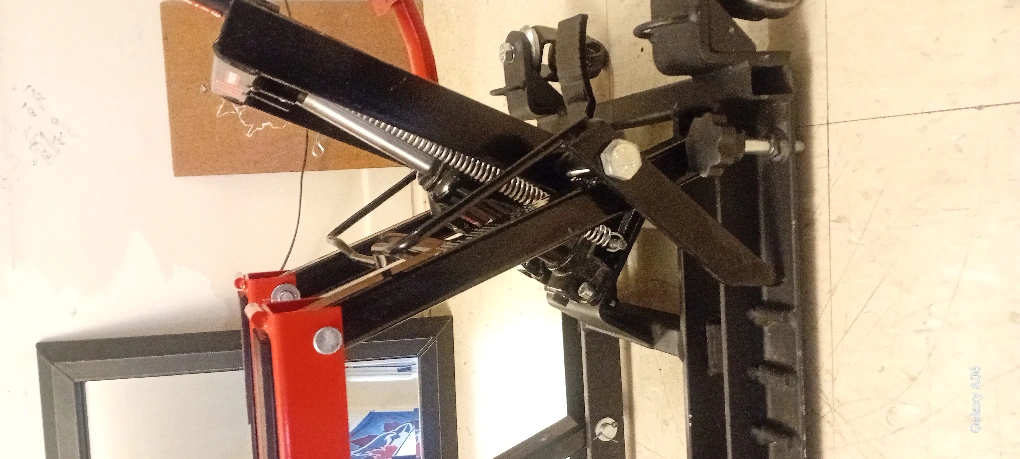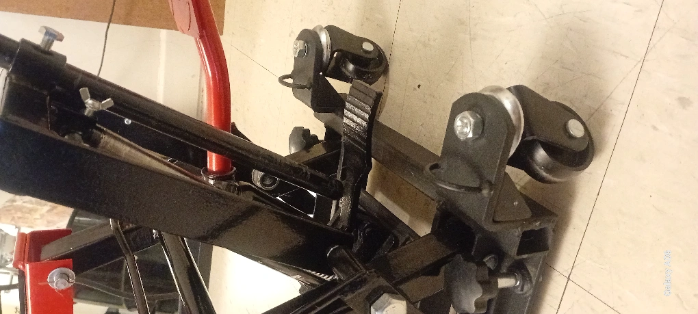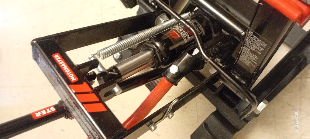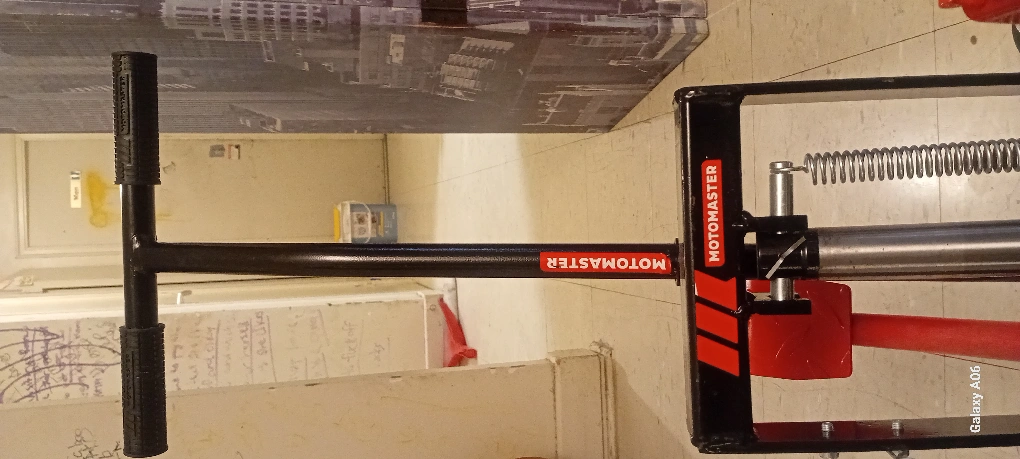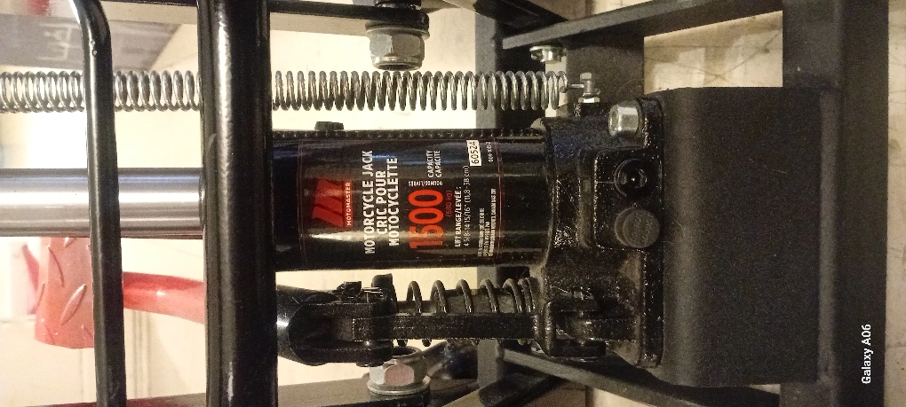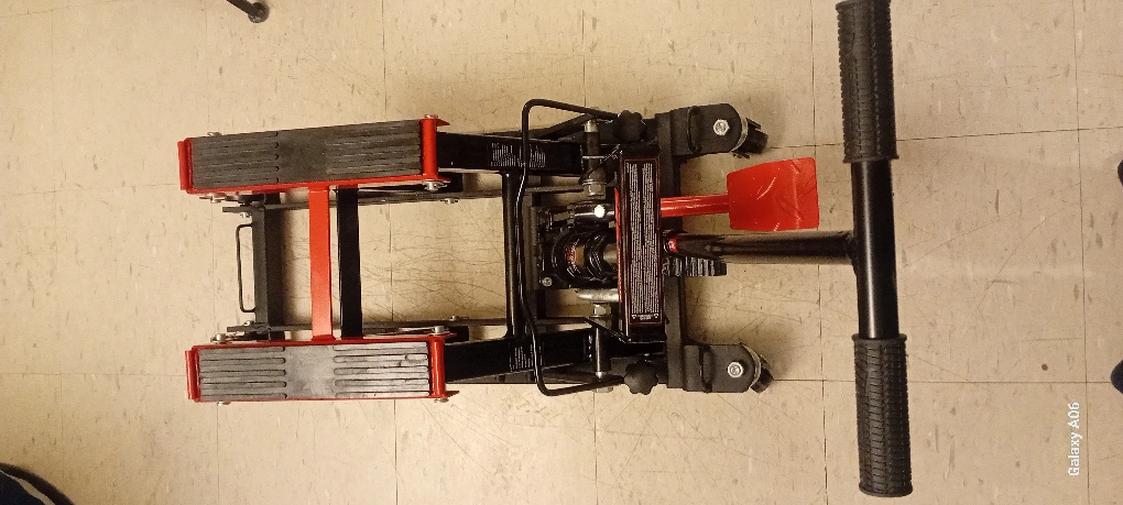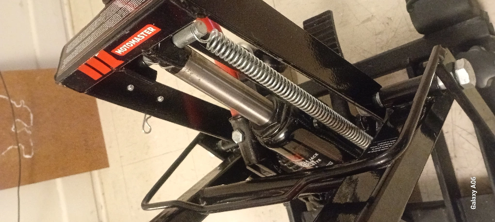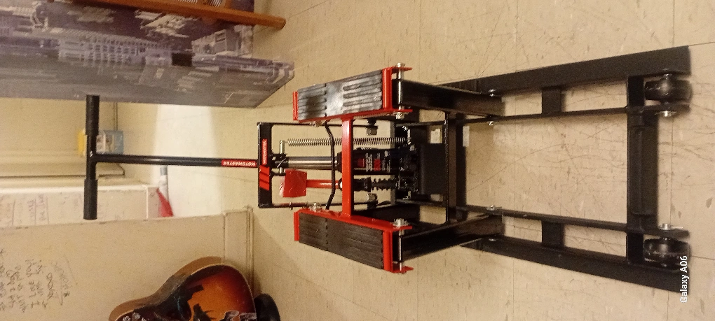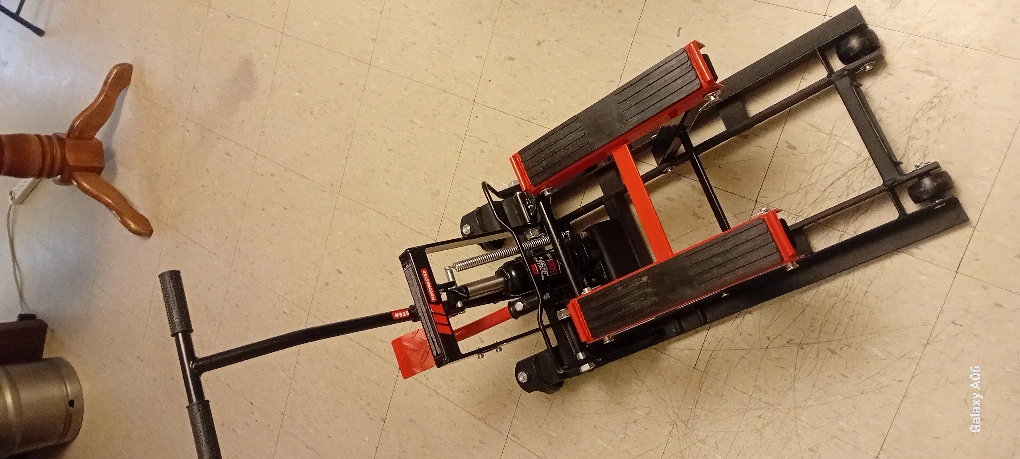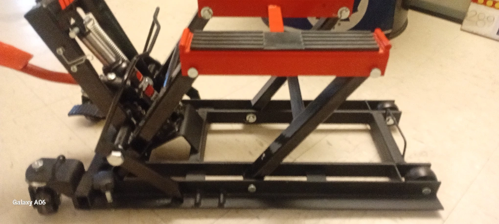 Hydraulic motorcycle lift. Features a long handle for easy operation. Durable steel construction. Includes transport wheels. Red and black colours.