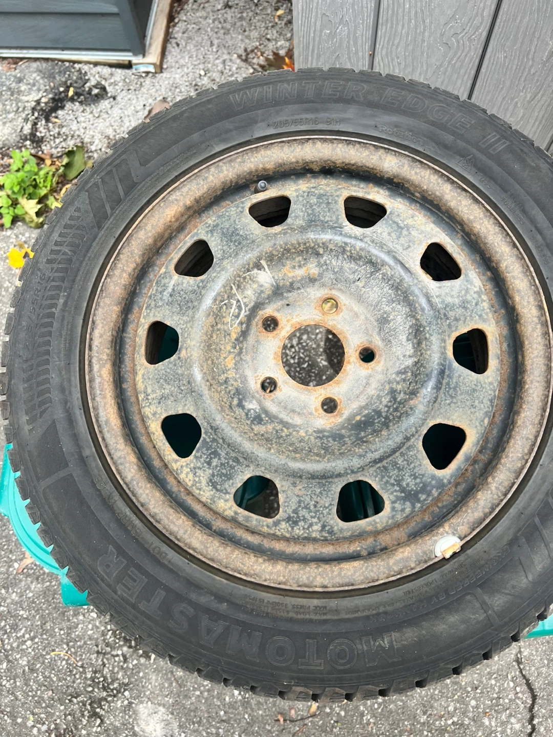 Motomaster Winter Edge tire for sale. Size is 205/55R16. It's showing some signs of wear. Used for 2 sessions. Comes with rims