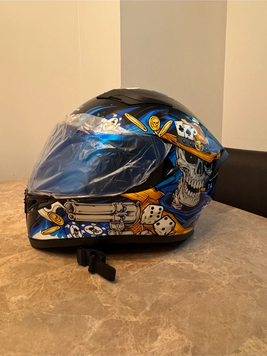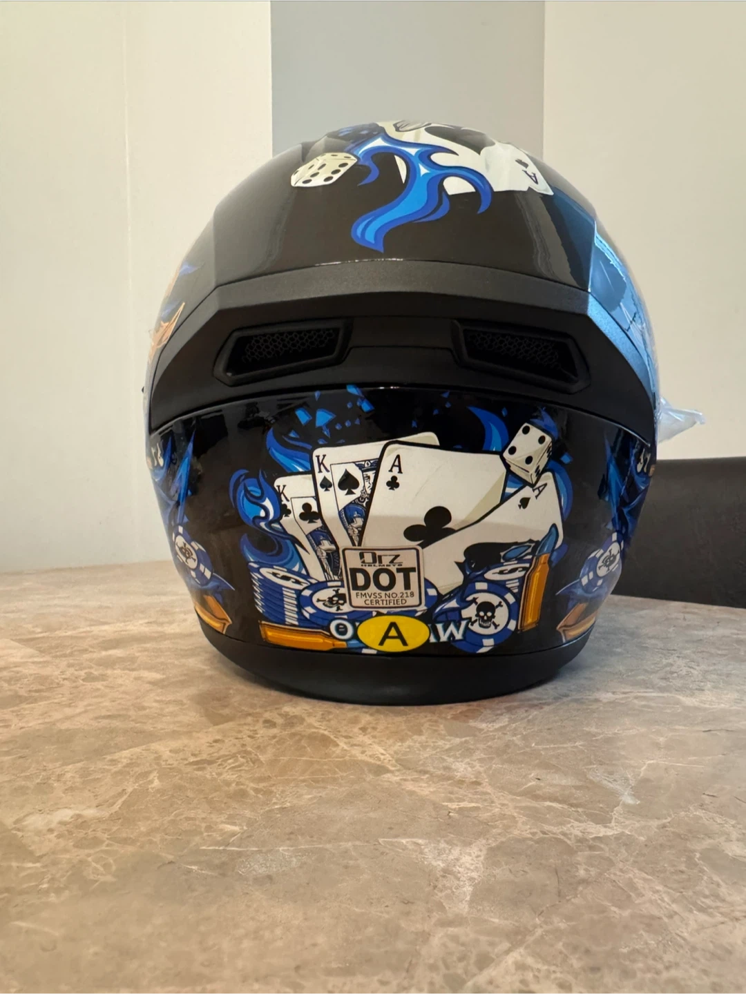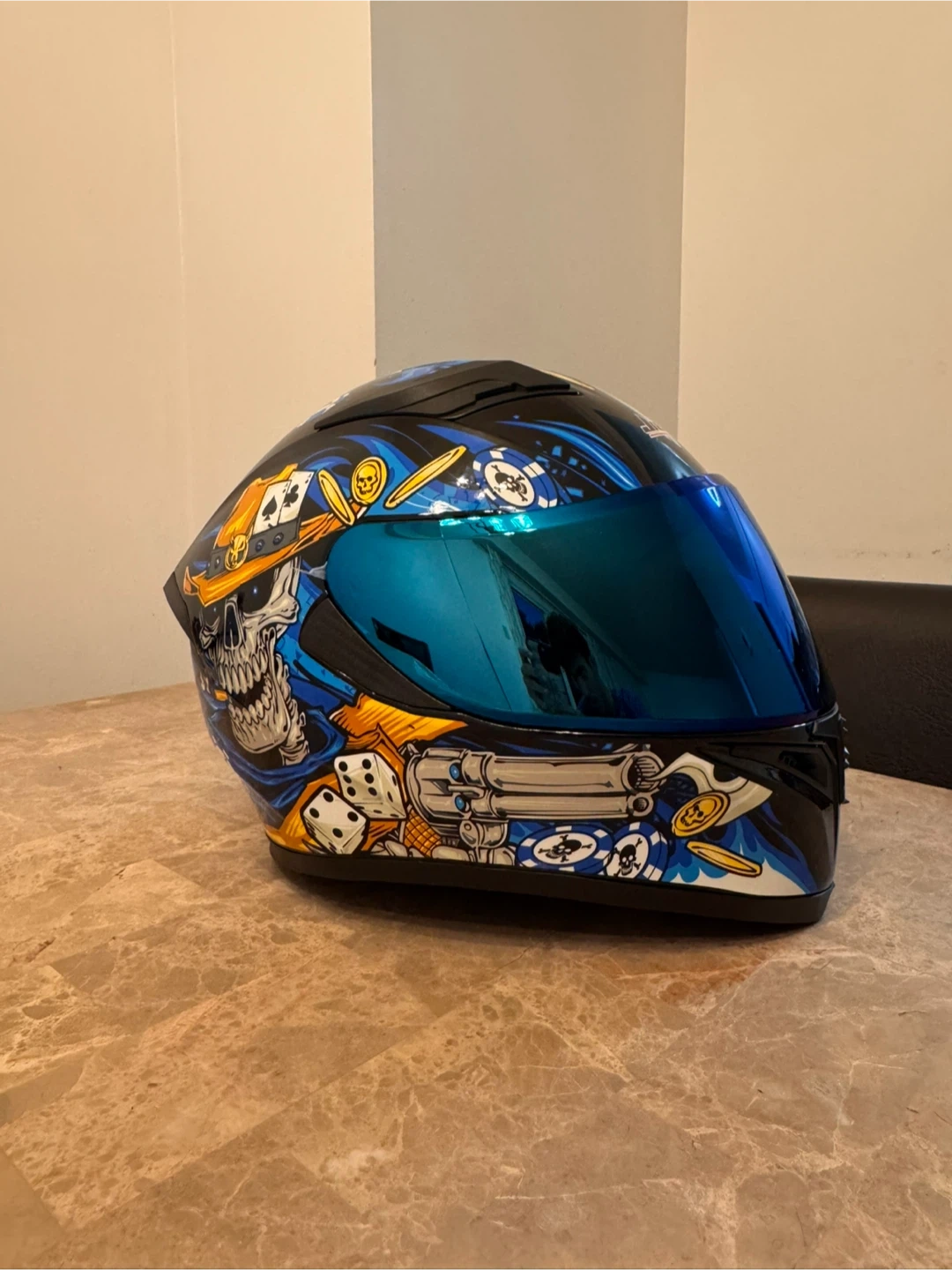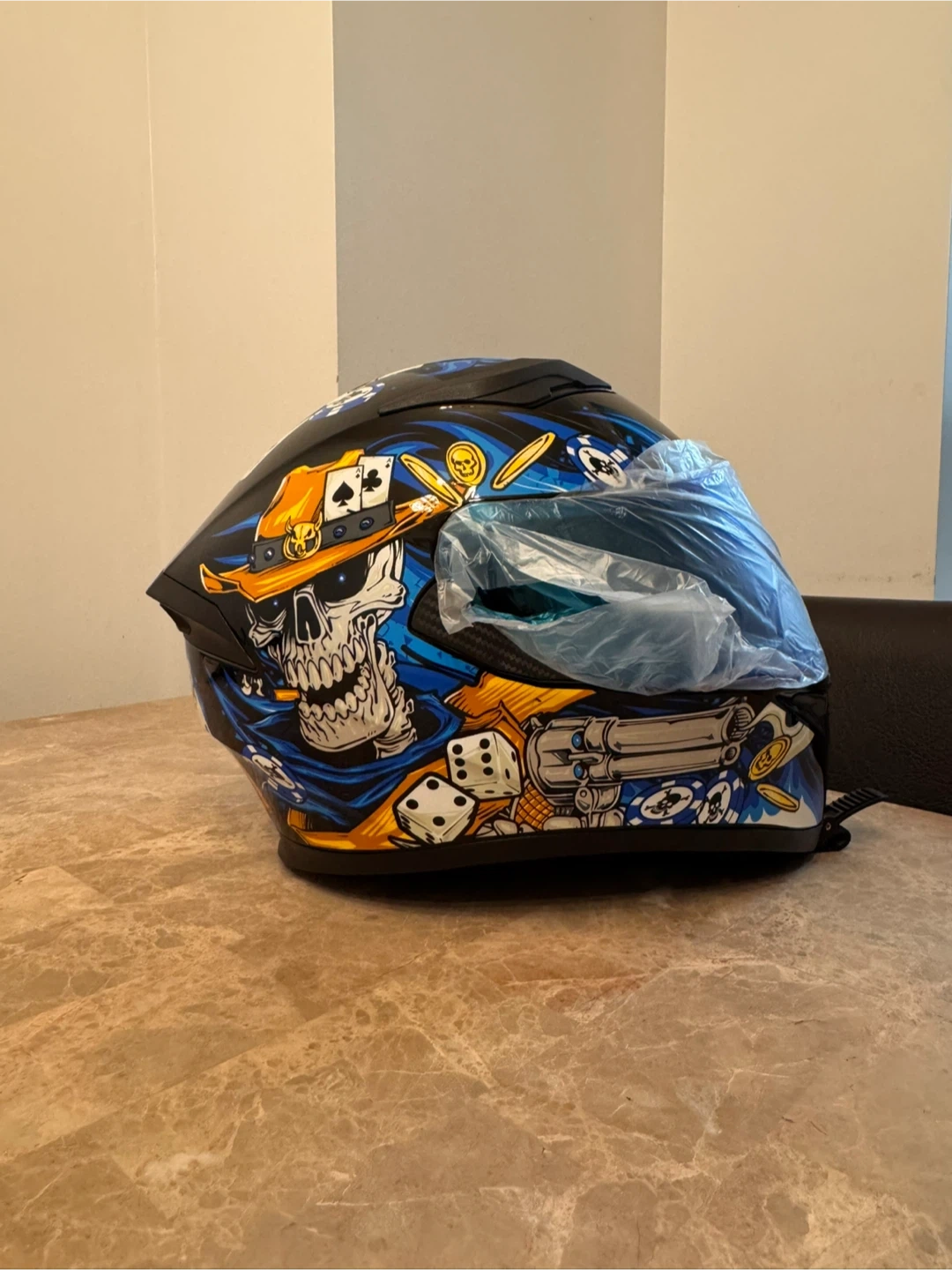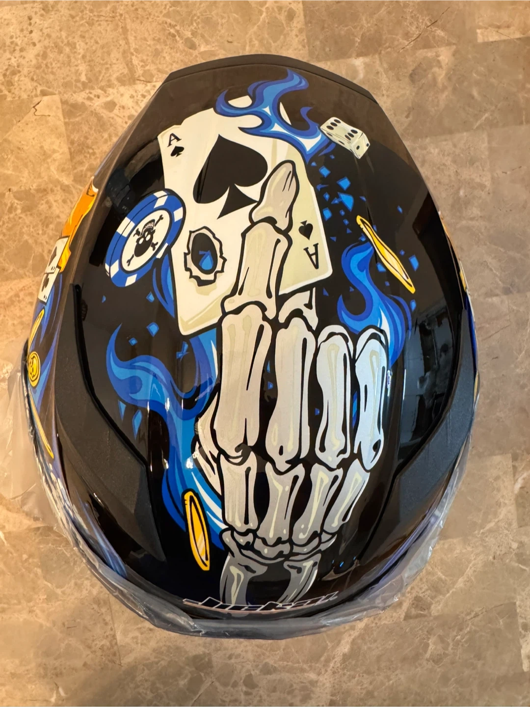 Looking to sell my HJC RPHA 11 helmet with a cool poker-themed design! It's in great shape and ready for a new rider. This helmet features a slick design with playing cards, skulls, and dice. Perfect for anyone wanting to stand out on the road!