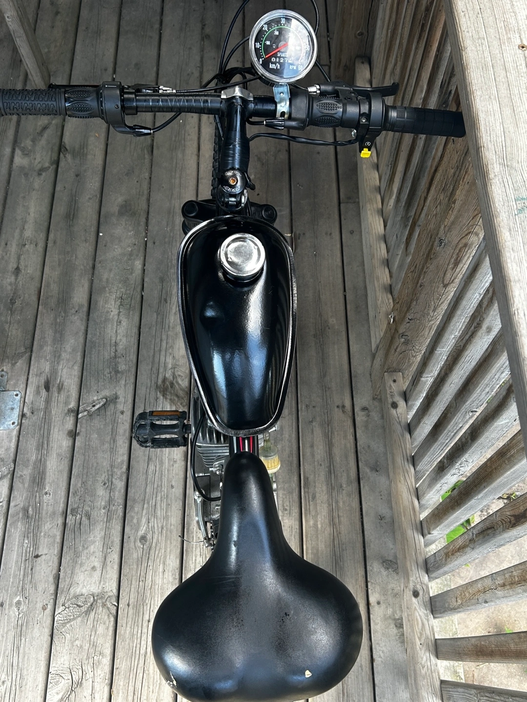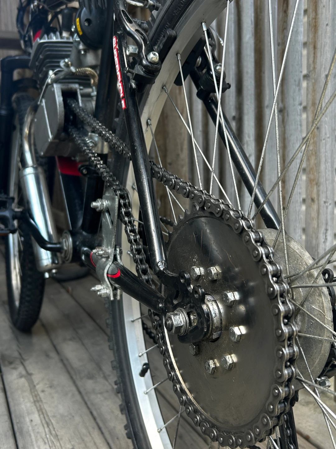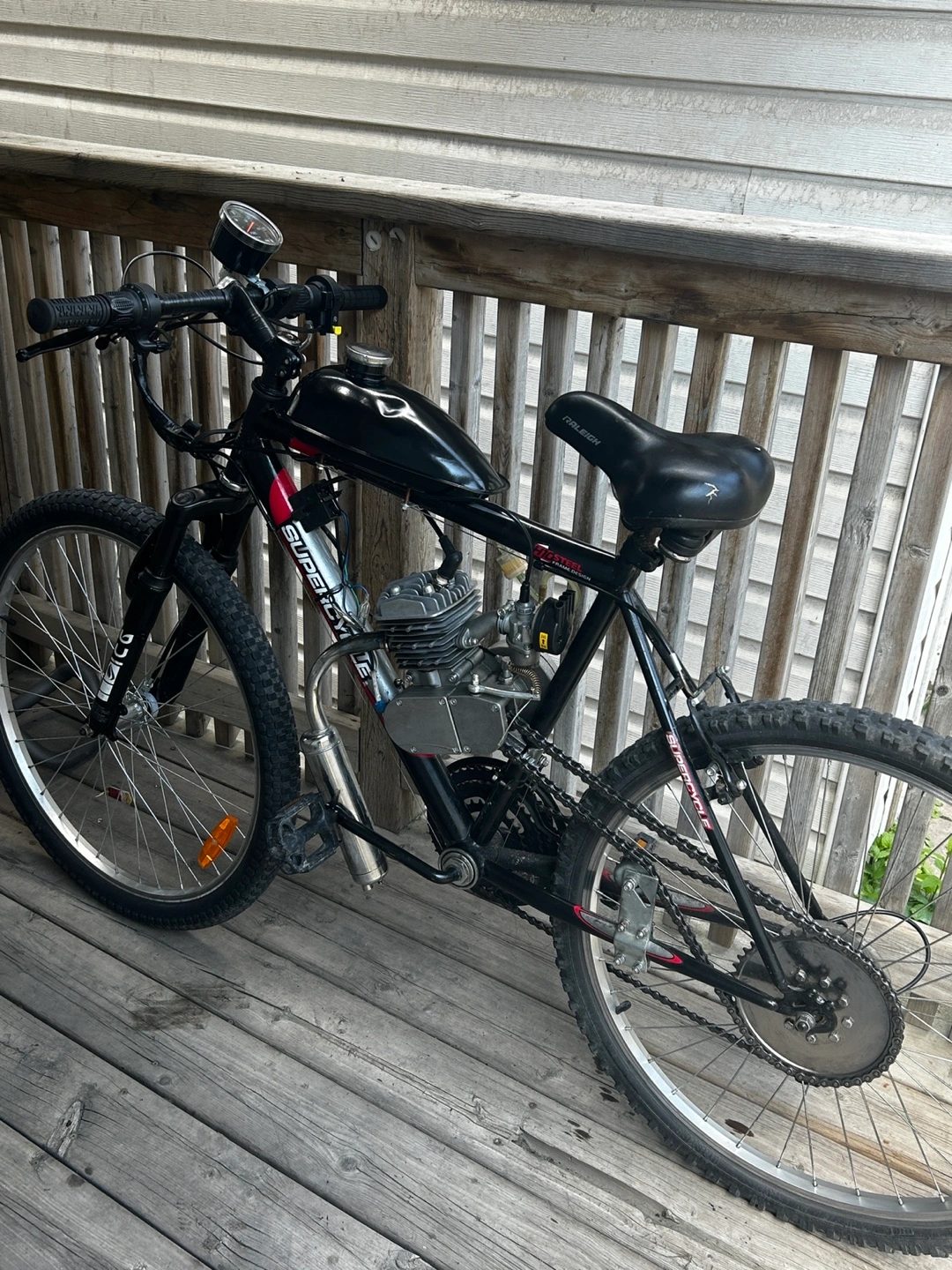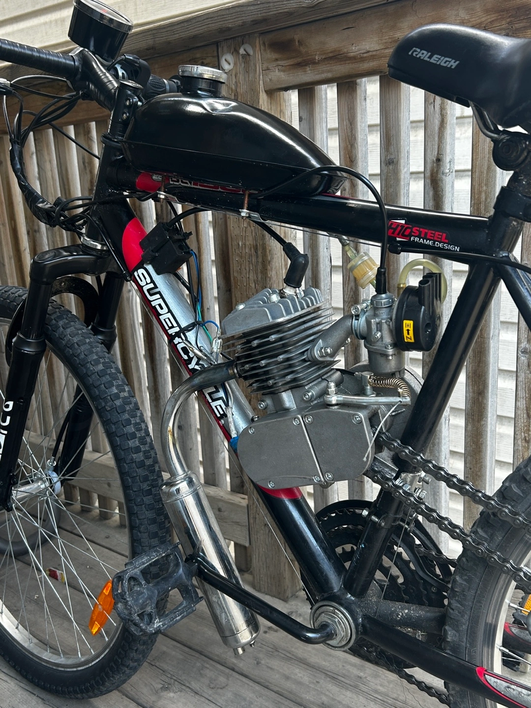 Selling a motorized bicycle with a Raleigh frame. It features a Big Steel frame design and a Supercycle front fork. The engine is mounted on the frame, and it has a speedometer. Great for getting around!