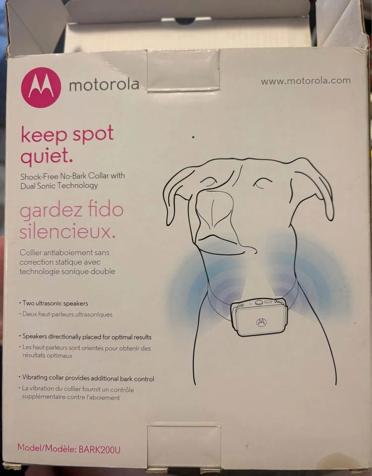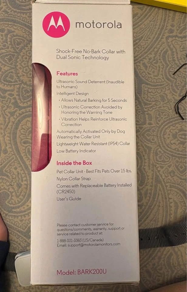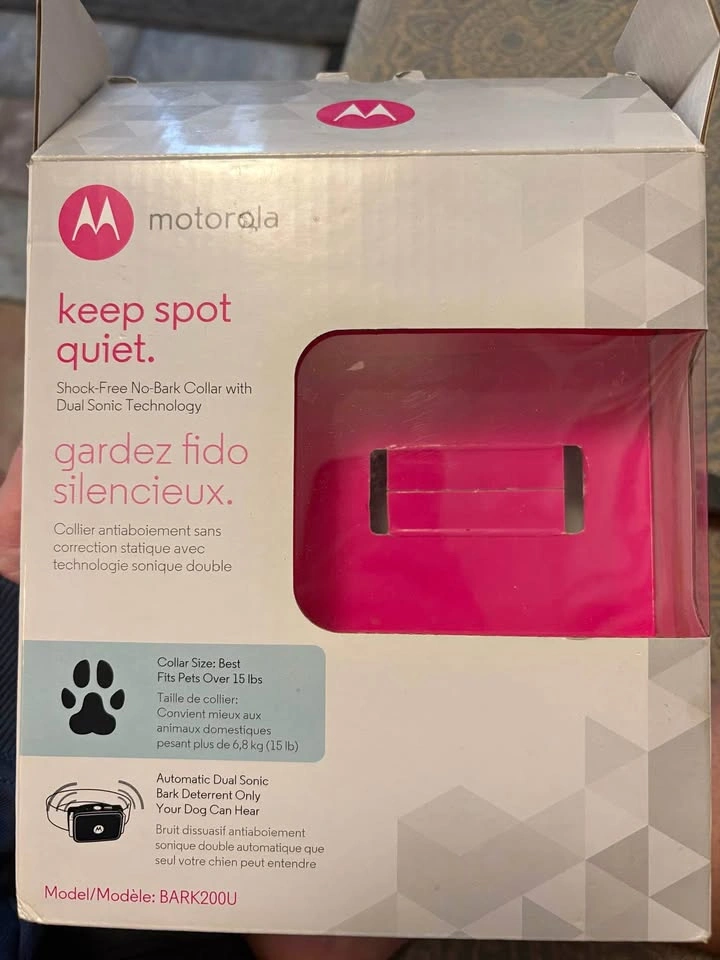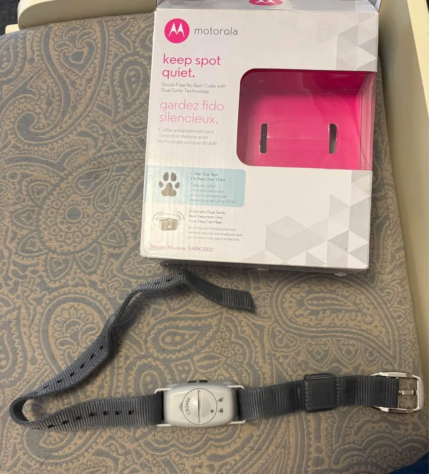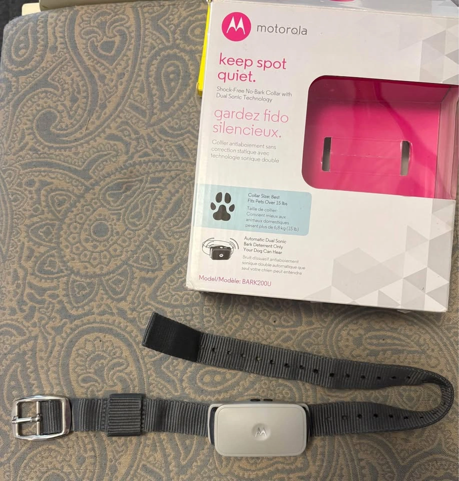 Shock free no bark collar with dual sonic technology. Best fits pets over 15lbs. See box photo for more information. Great condition - just needs a new CR2450 battery.