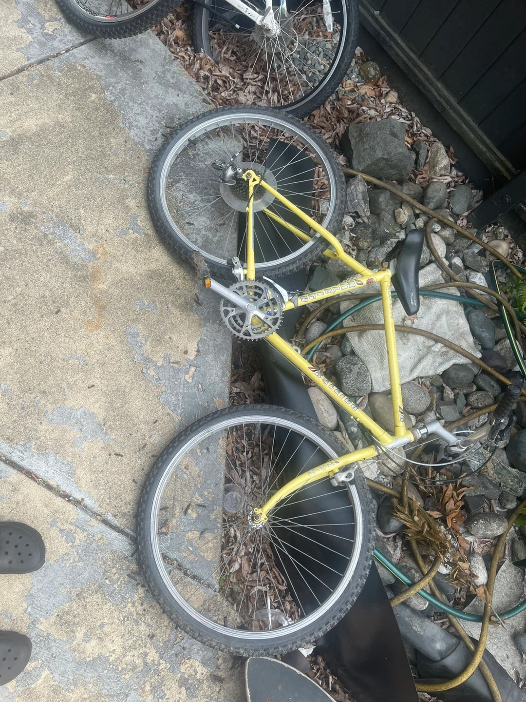 79Selling a yellow mountain bike! It's in used condition, but still has plenty of life left in it. Perfect for hitting the trails or just cruising around town