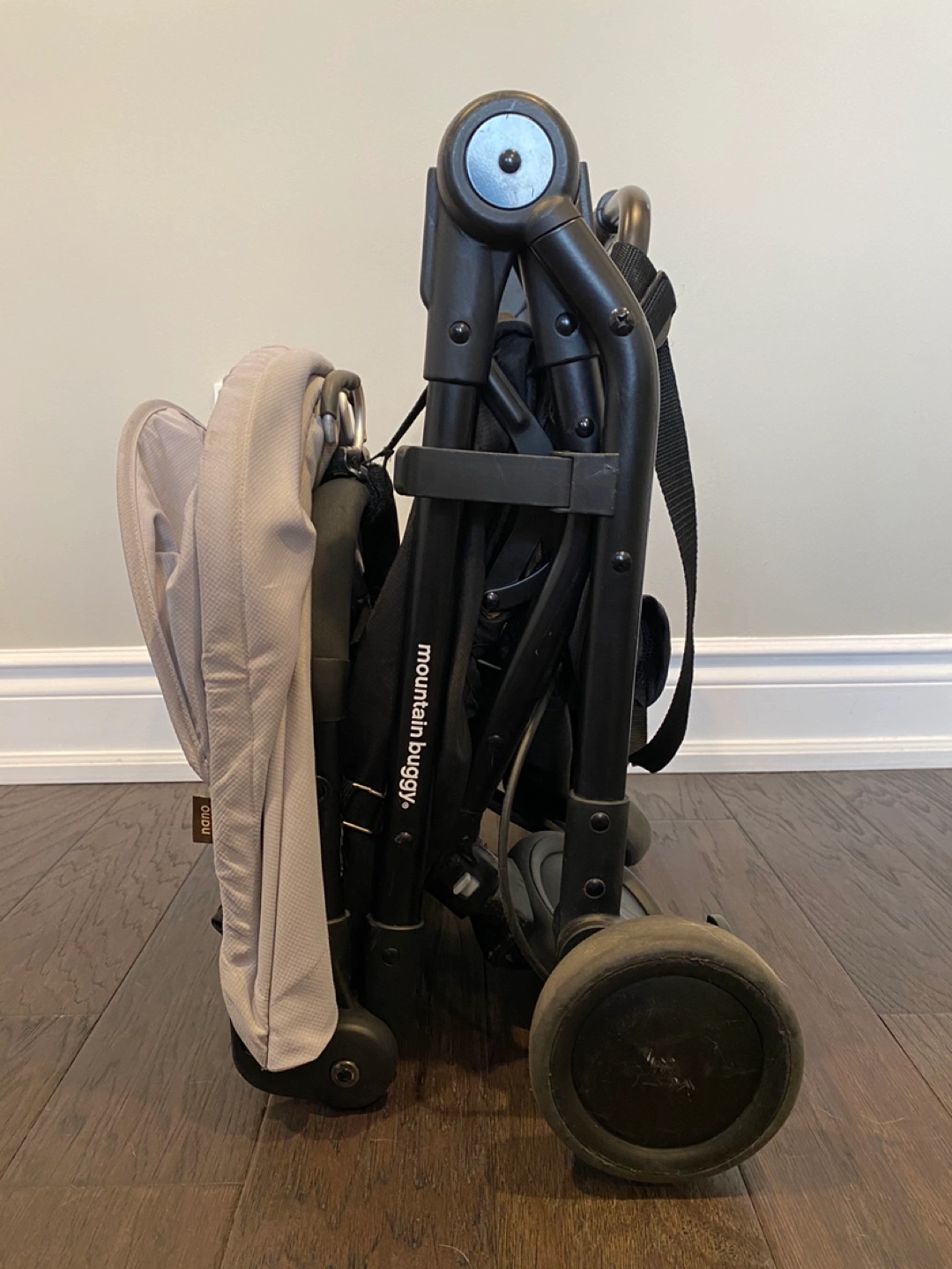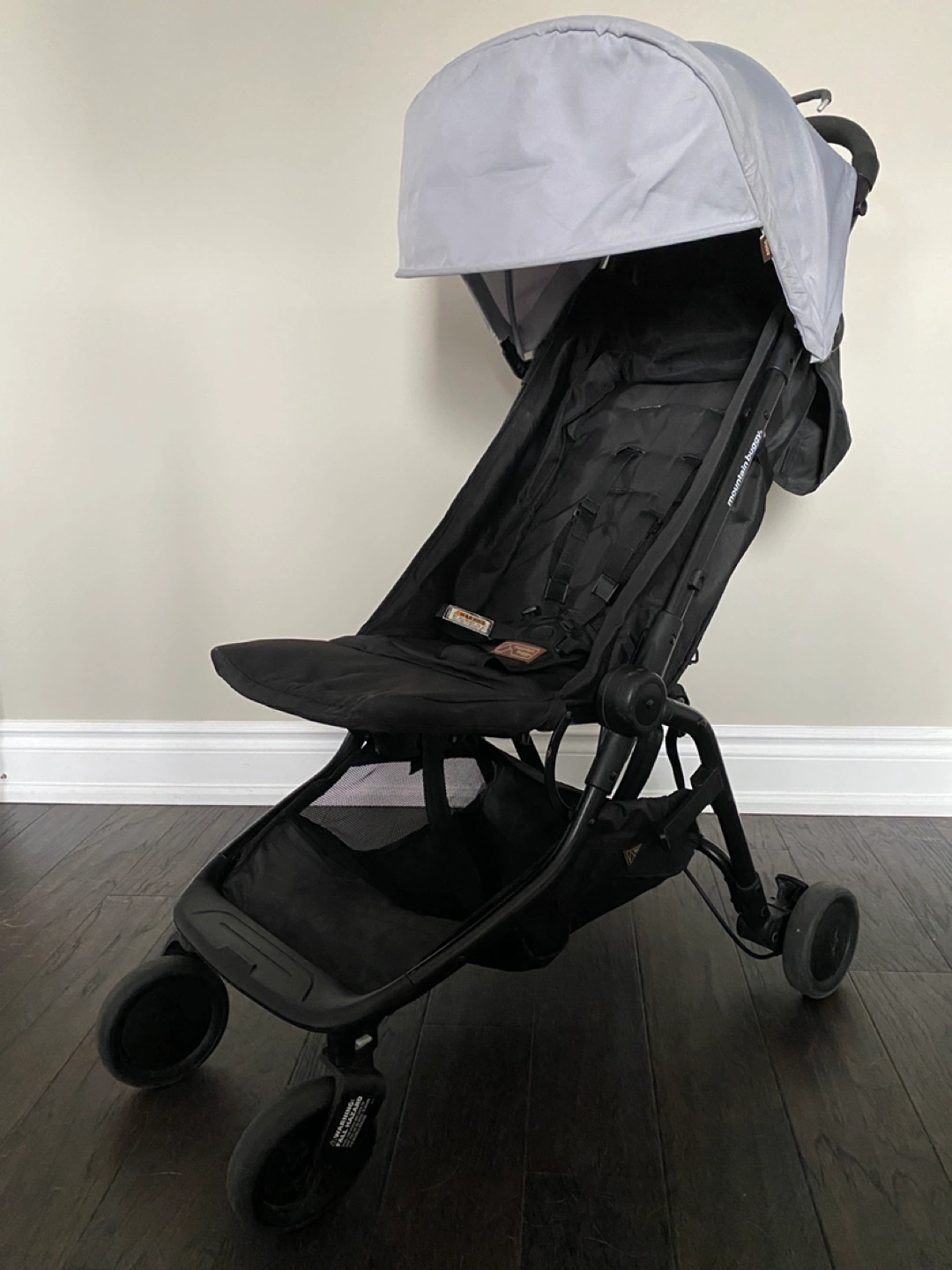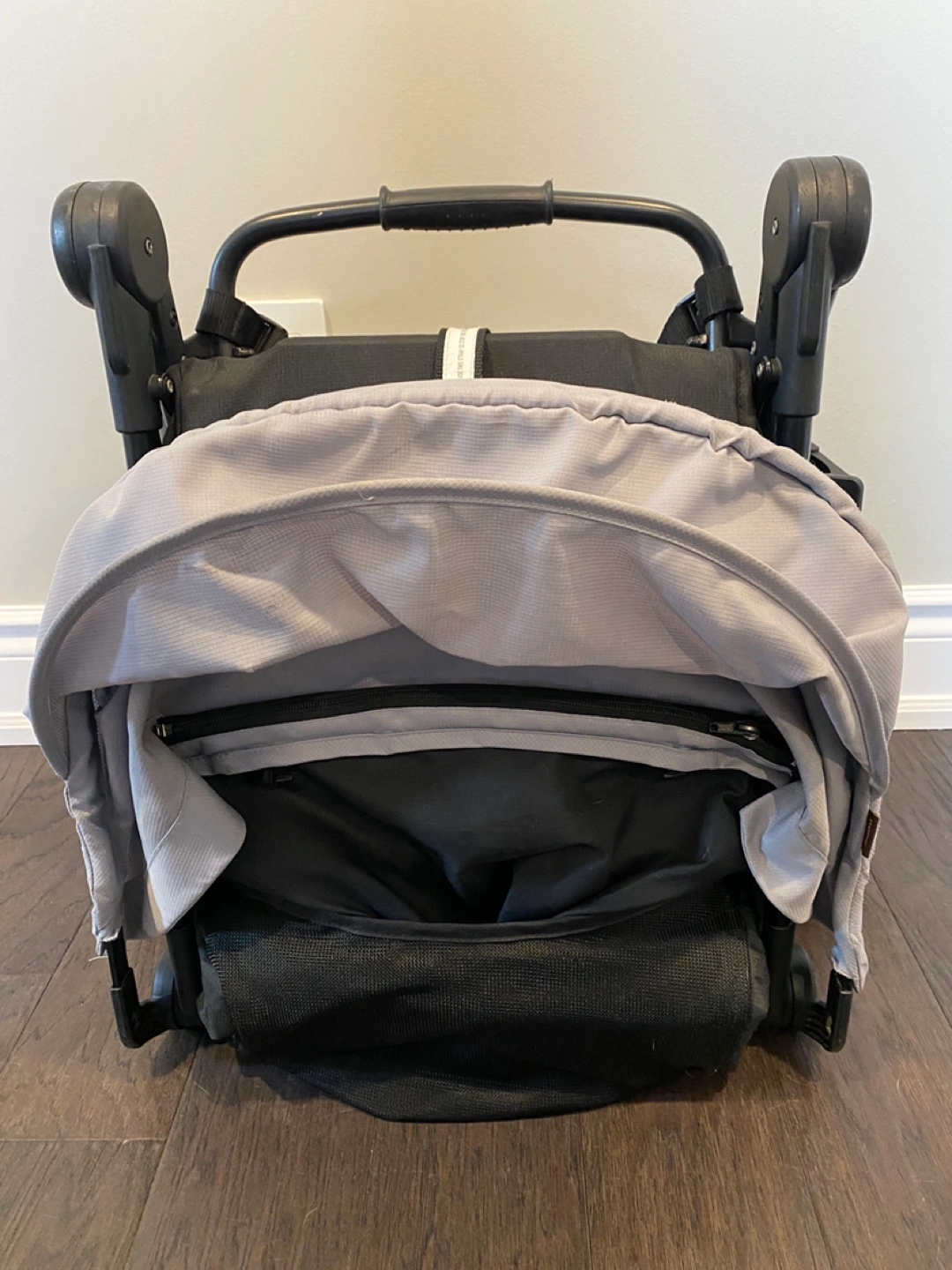 36Grey canopy, black frame. Includes a storage basket. Folds easily and compact. Light weight