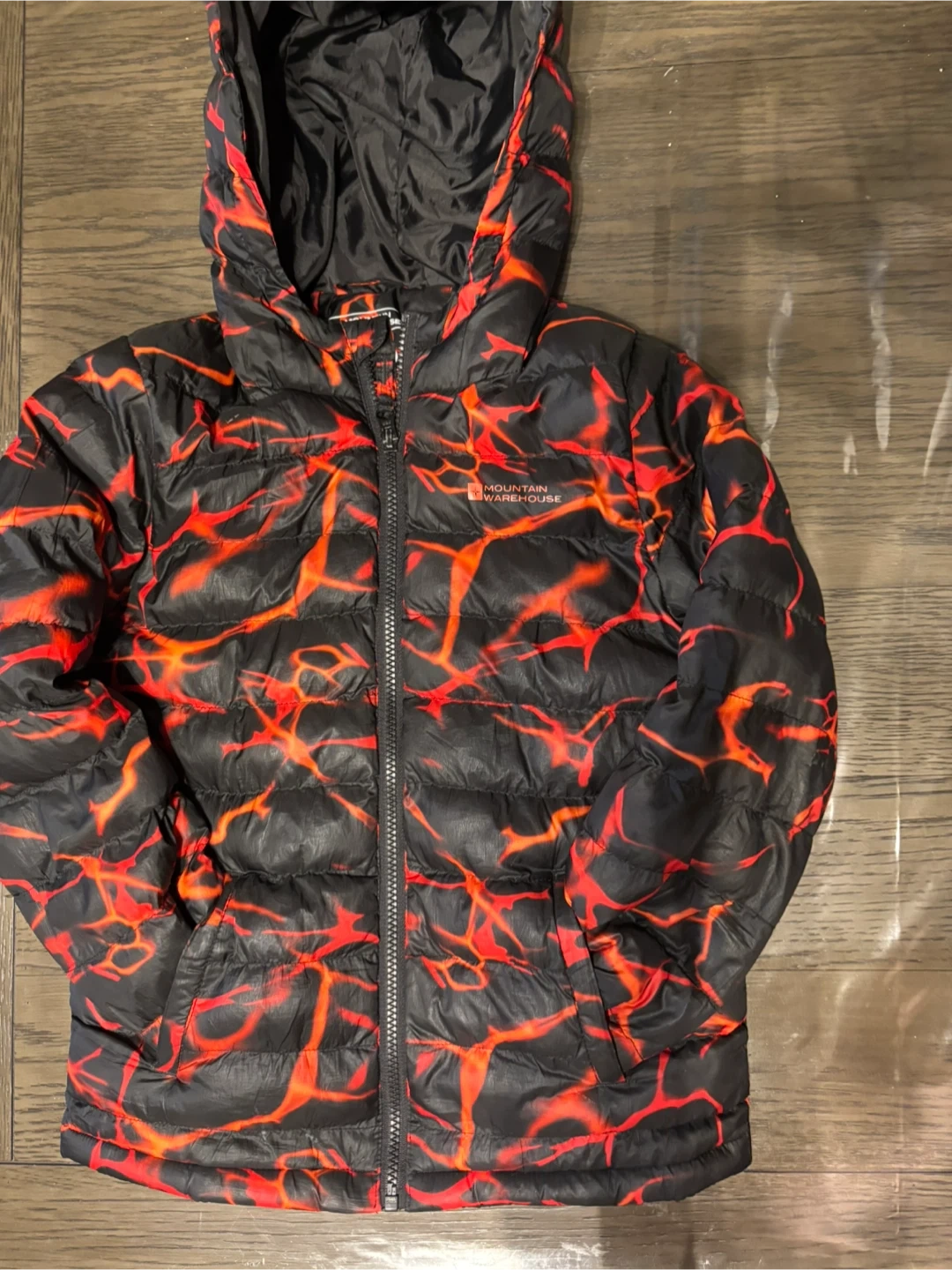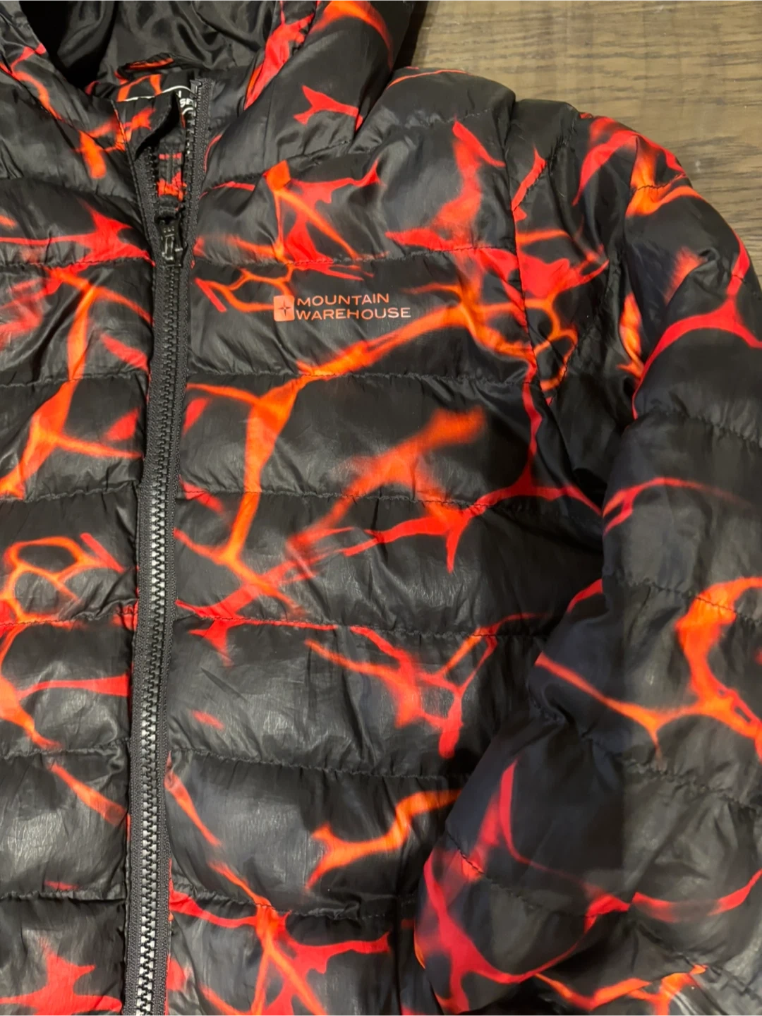 Selling a Mountain Warehouse padded jacket. It features a striking black and red design. Perfect for staying warm and stylish! Ages 7 to 8 year old