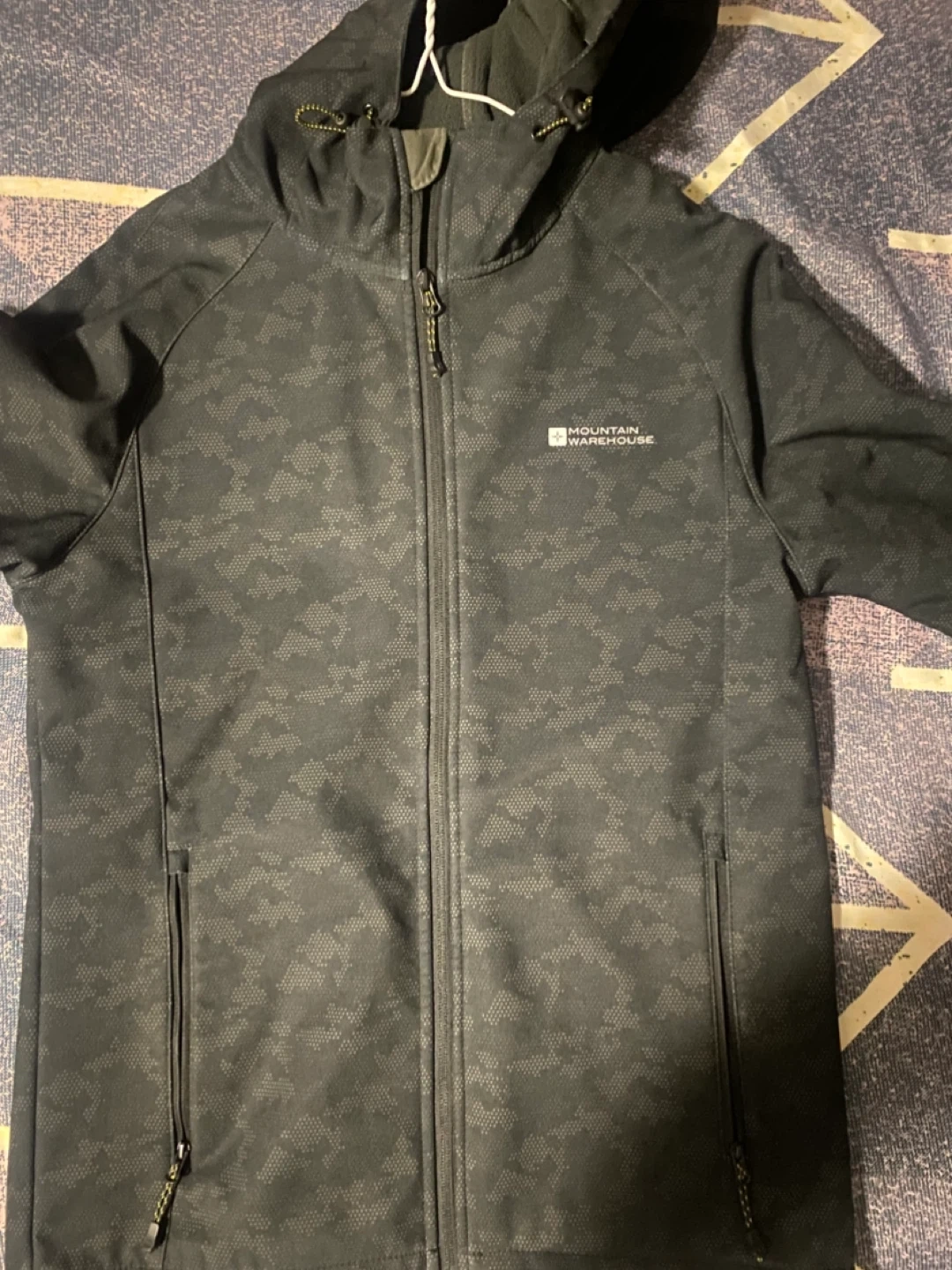 10Selling a Mountain Warehouse softshell jacket in size small. It's a water-resistant jacket, perfect for light rain and wind. Great for outdoor activities!