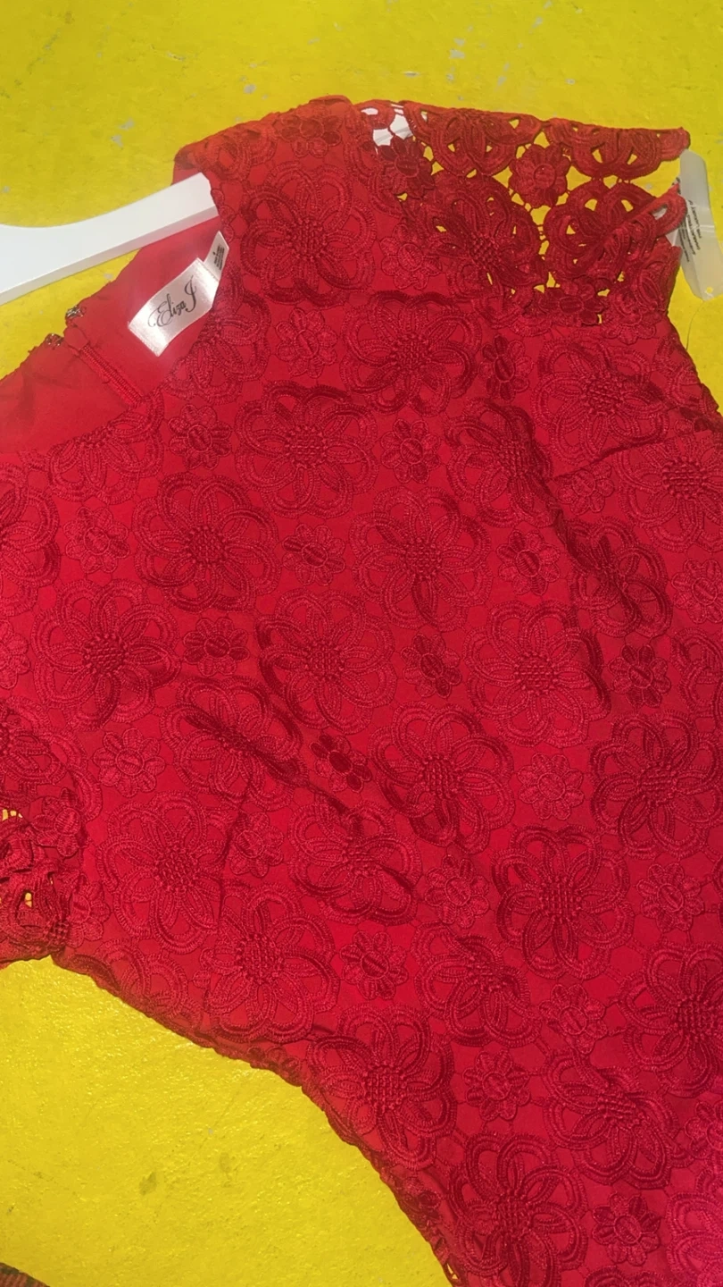 Gorgeous Eliza J red lace dress with a beautiful floral pattern. It features a flounce hem and short sleeves. Perfect for a special occasion!