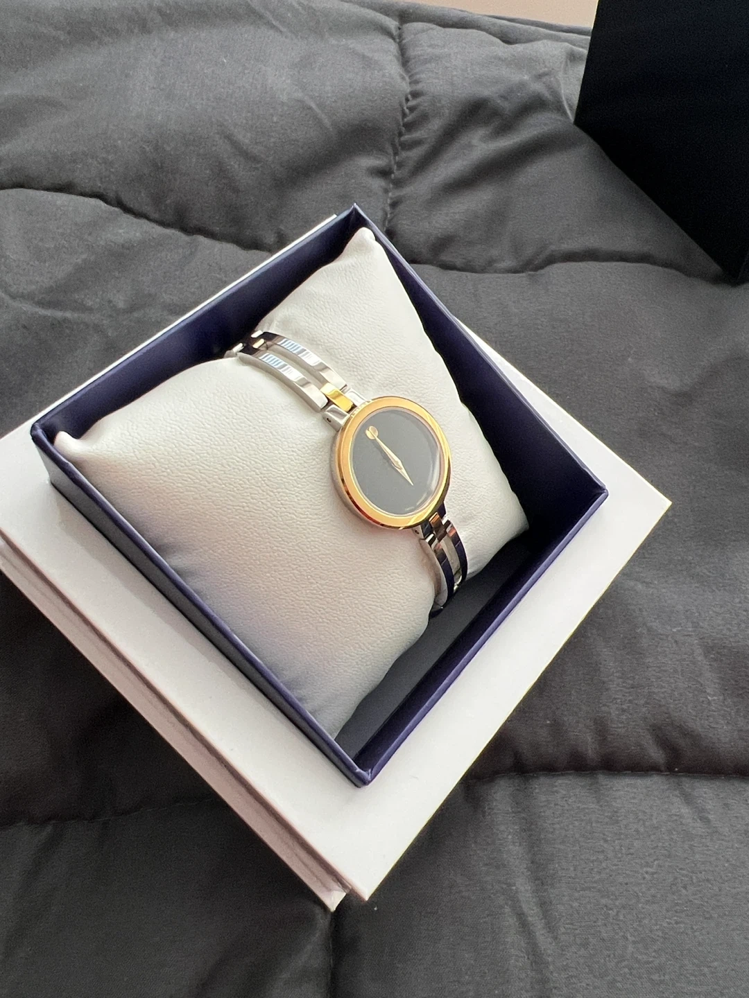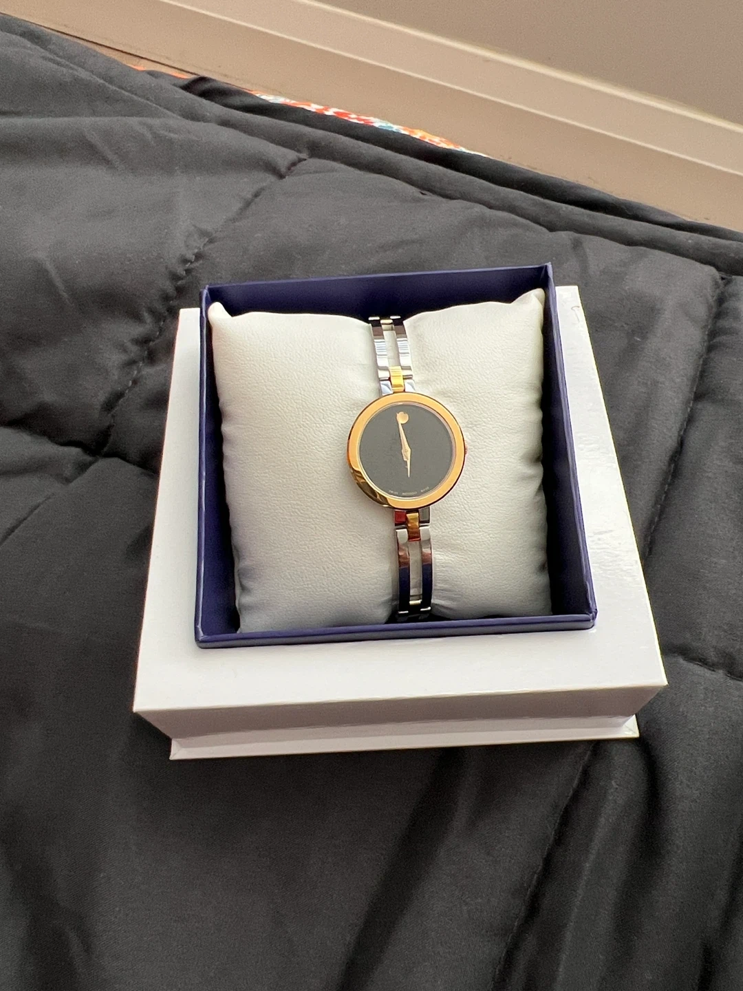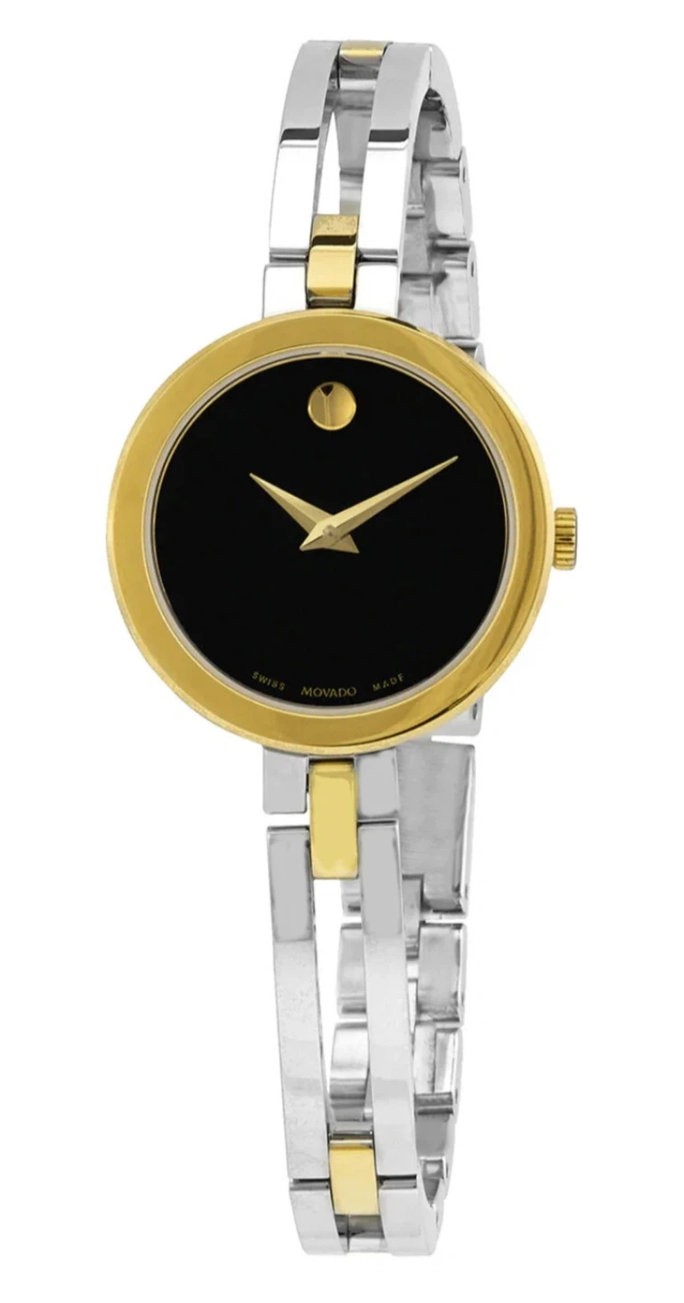Selling a beautiful Movado Museum Classic watch! The watch features a sleek black dial with gold accents and a two-tone silver and gold bracelet. It comes with its original box and packaging, making it a perfect gift or a treat for yourself! The watch is in excellent condition and ready to be worn and enjoyed. NEVER BEEN WORN. STAINLESS STEEL WRAP INTACT.