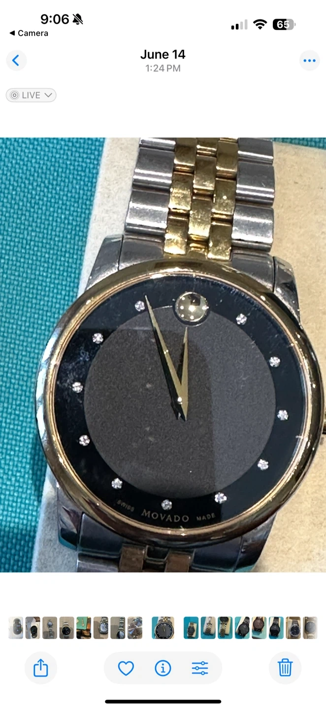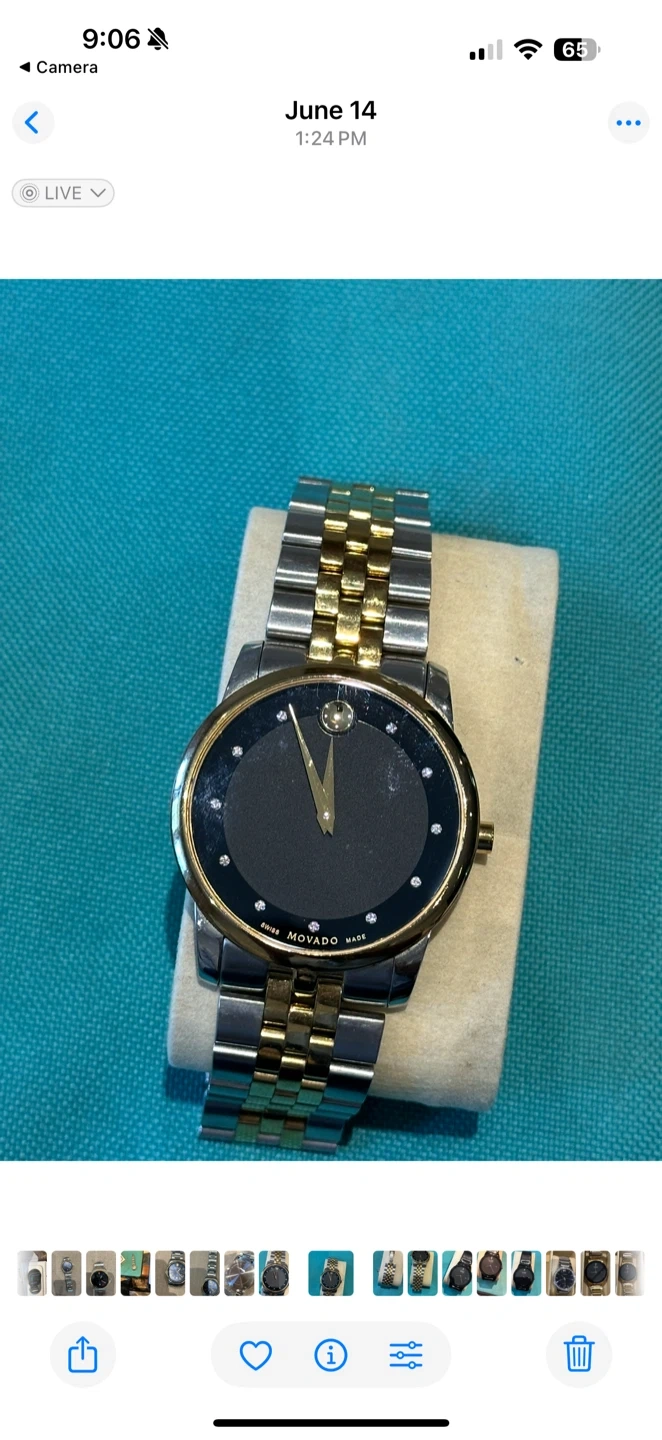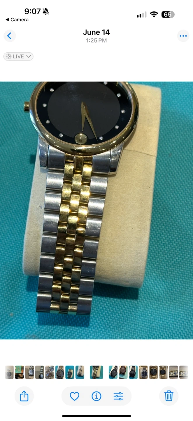 Selling a Movado watch in two-tone stainless steel. It features a black face with gold hands and diamond accents. The band is a combination of silver and gold-tone links. It's in great condition and ready for a new owner