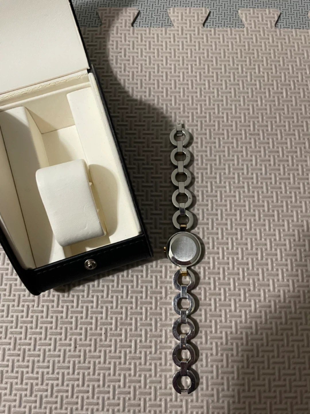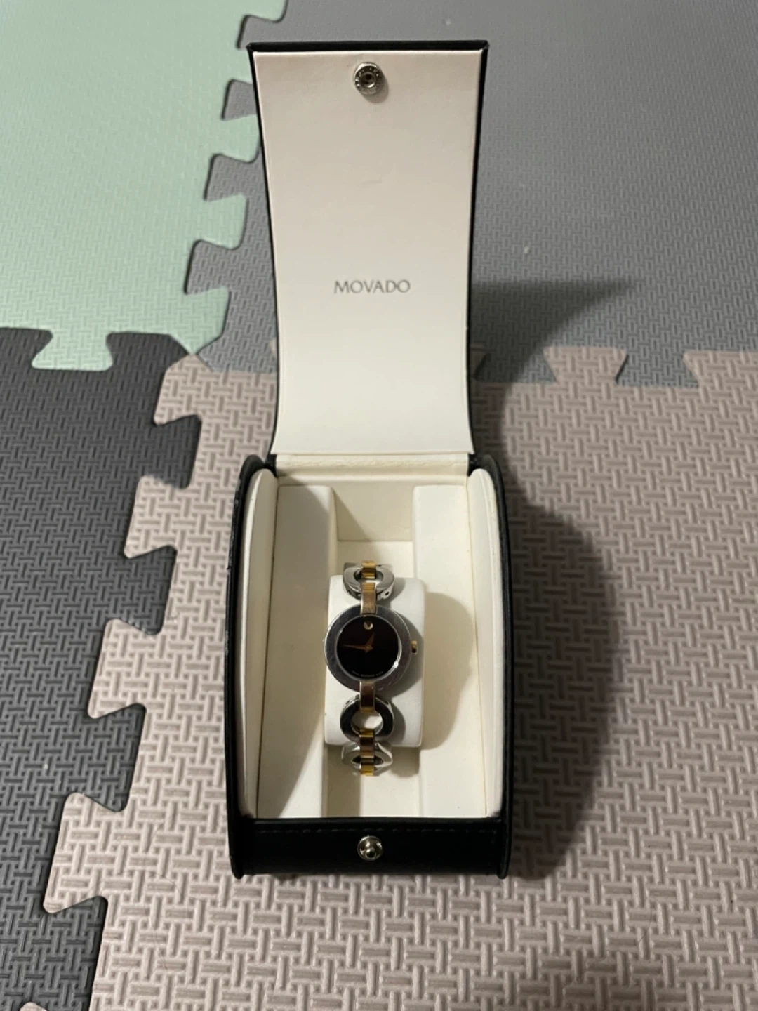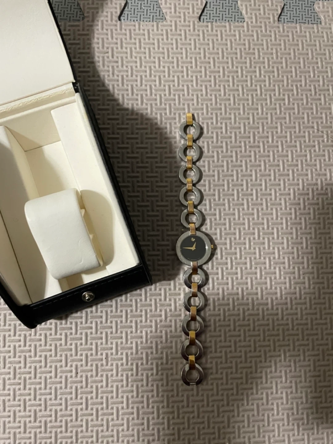 10Selling a Movado women's watch. The watch features a unique band design with silver and gold-tone accents. It is in good condition!