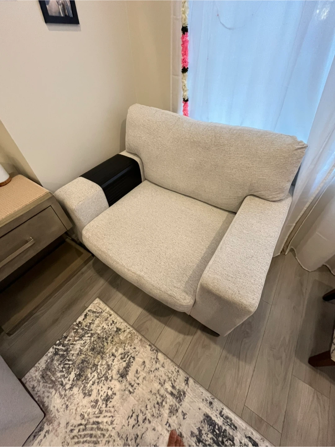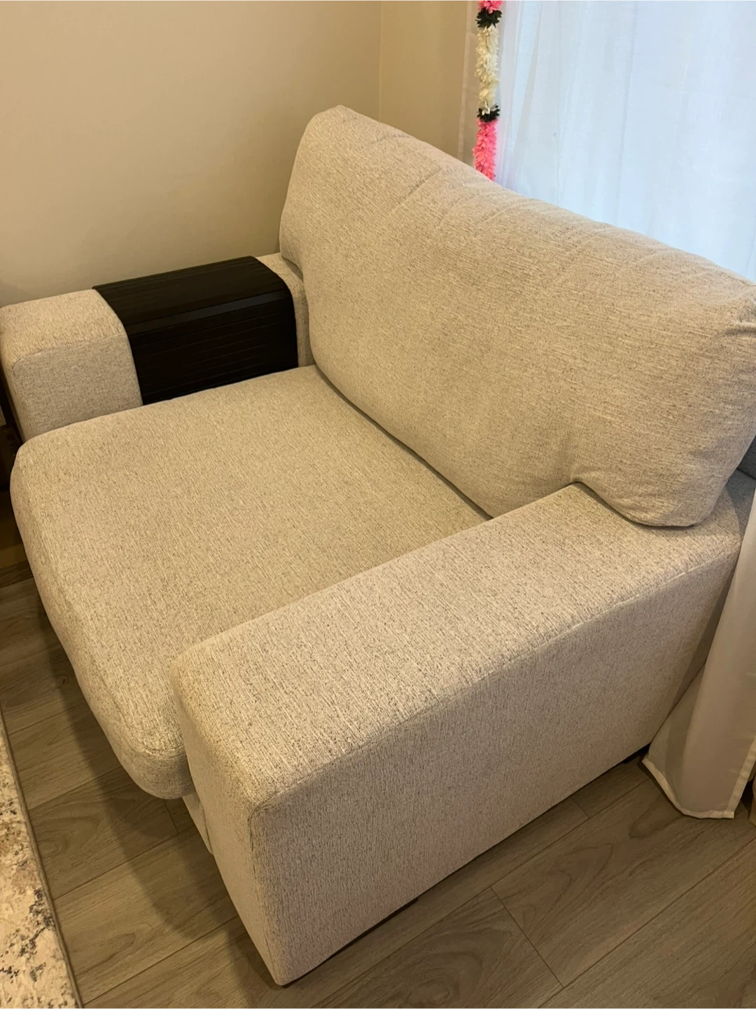 10Dimensions: 51″ W × 40″ D × 37″ H Features: • Upholstered in performance fabric — built to resist spills and wear • Plush, reversible back & seat cushions • Wide, deep seating — great for lounging • Includes accent pillow • Compact “chair & a half” size — roomy but still fits smaller spaces Condition: Gently used / excellent condition (no major stains, tears, or odors) Availability of 2 quantities, price is for 1. Pickup: Winona, Stoney Creek