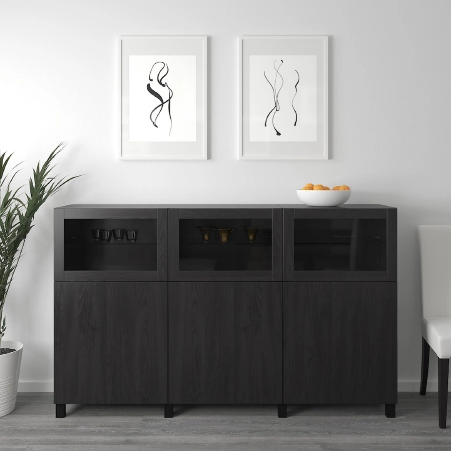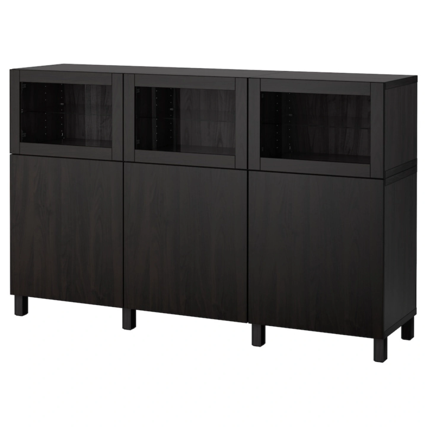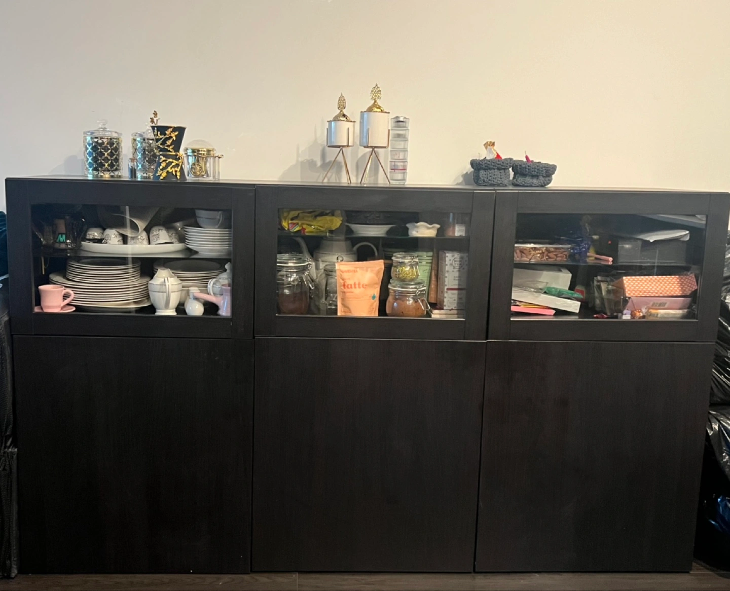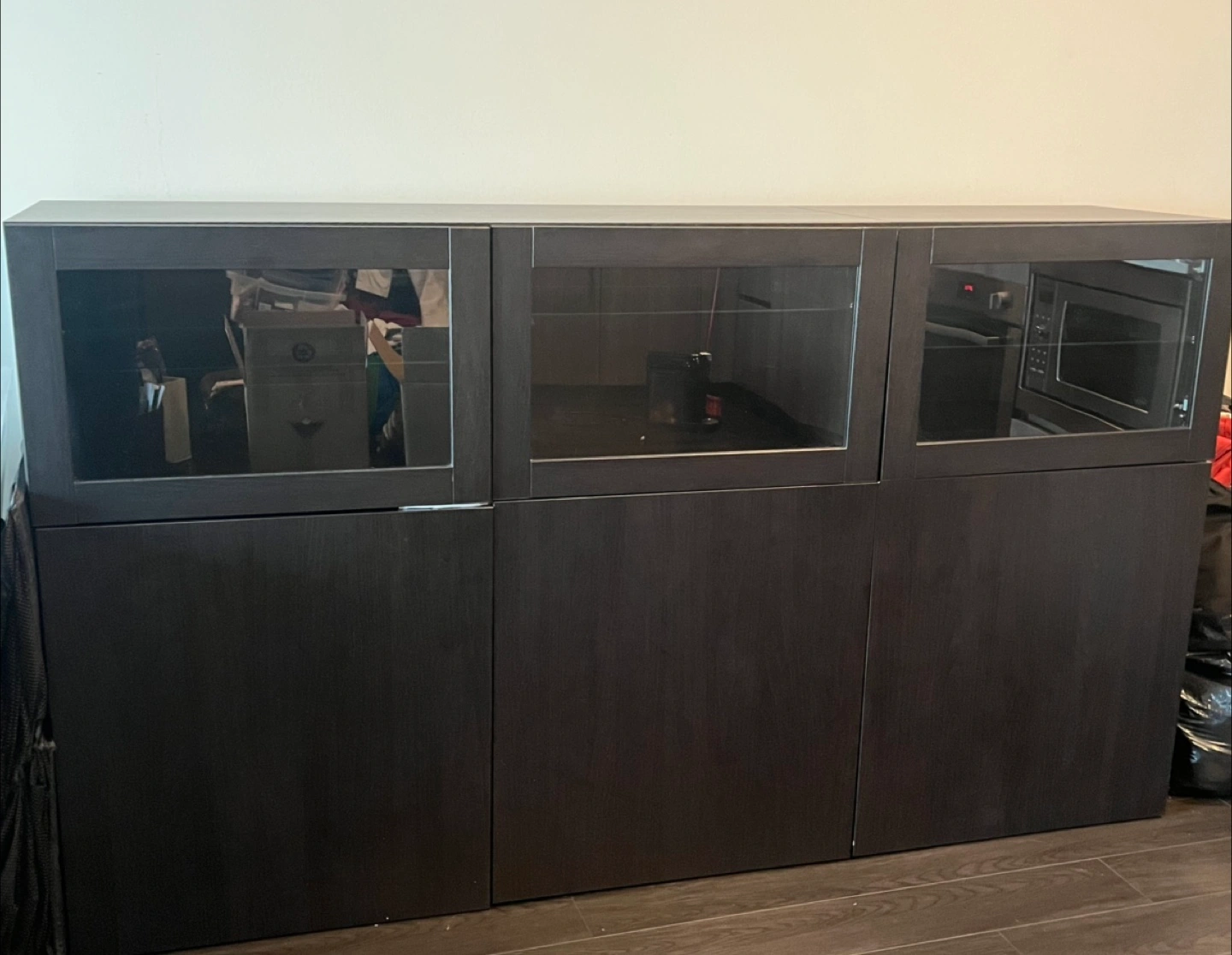 116Black-brown storage combination with doors and glass. Dimensions: 180x42x112 cm. Current on Ikea for $700 after tax Selling 50% off. Note: The storage combination is sold without the legs shown in the photo. Pickup: downtown toronto Message me for details and pics! Checkout my page for move out sale items! Can be separated in two sets for easy transport.