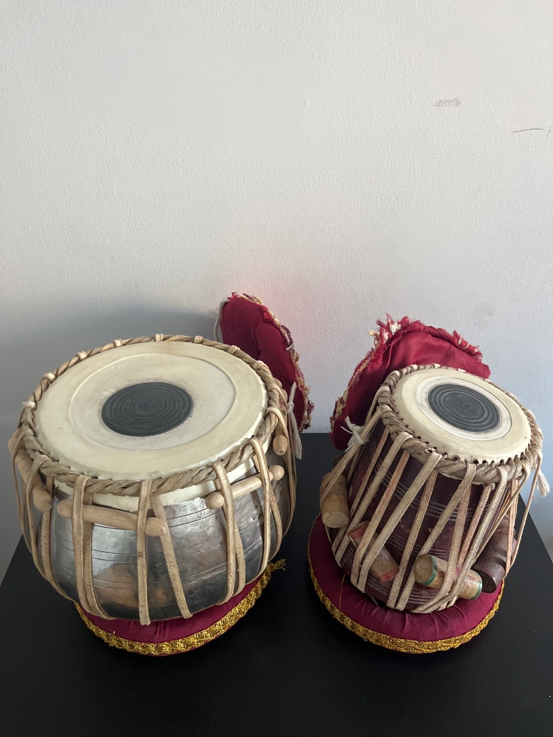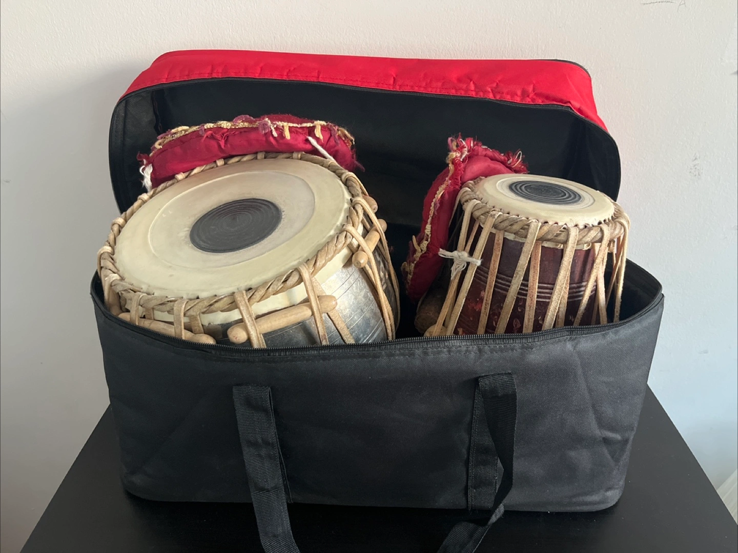 Selling a Tabla set, which includes two drums (tabla and bayan) and cushions. It also comes with a carrying case for easy transport and storage