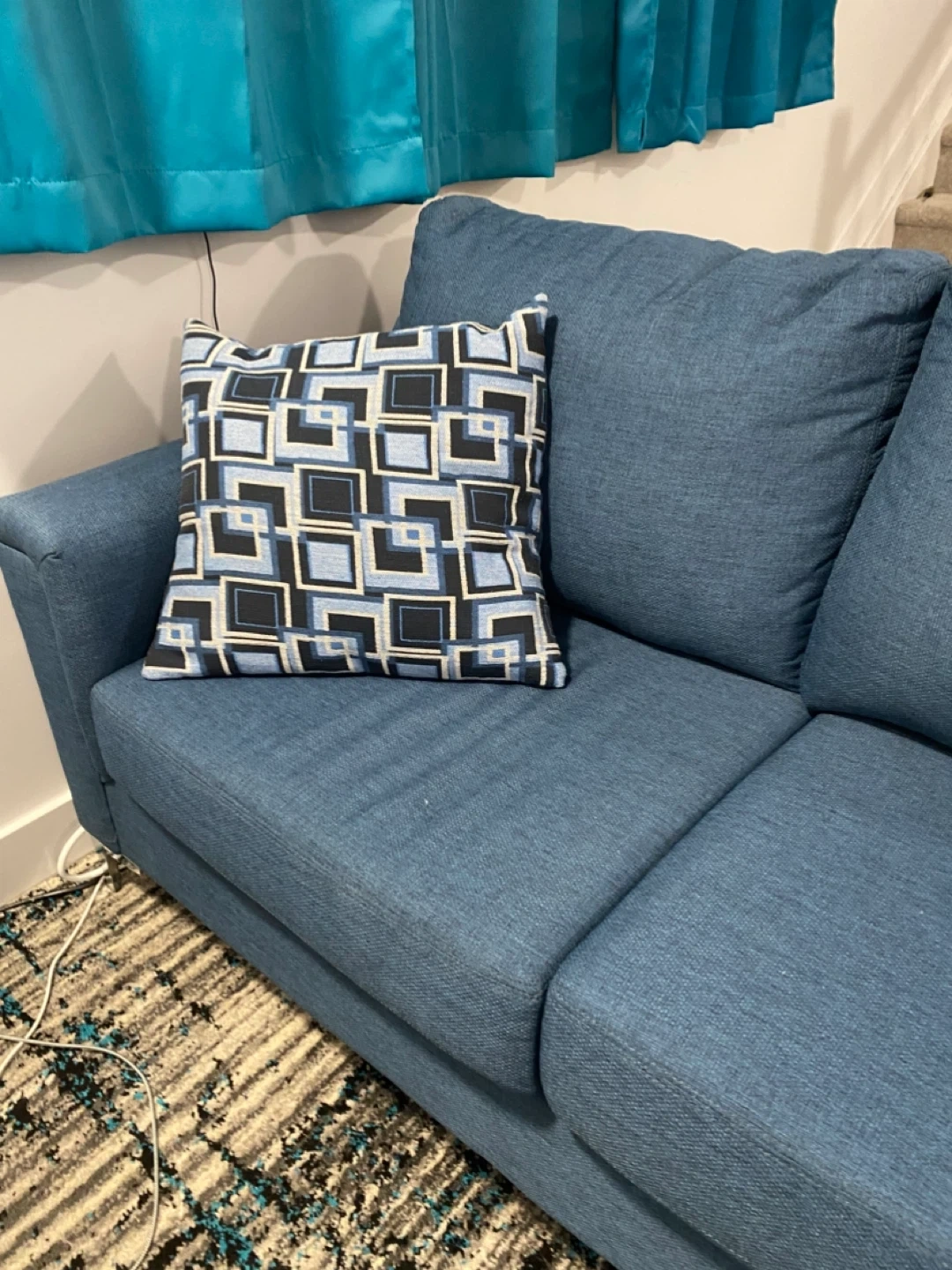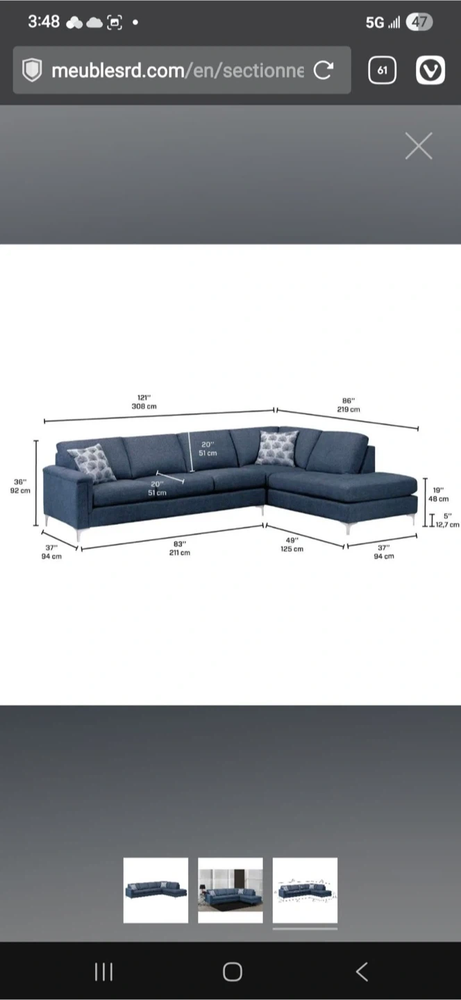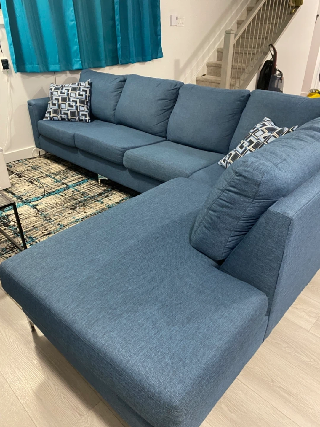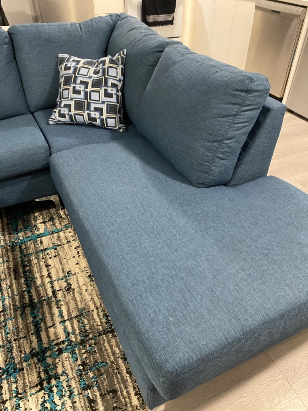 Looking to sell this comfy blue sectional sofa! It features a chaise lounge for extra relaxation. Dimensions: - 121" (306 cm) length - 83" (211 cm) width - 96" (218 cm) length on the other side - 36" (92 cm) height It's in great condition and ready for a new home!