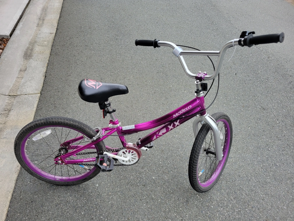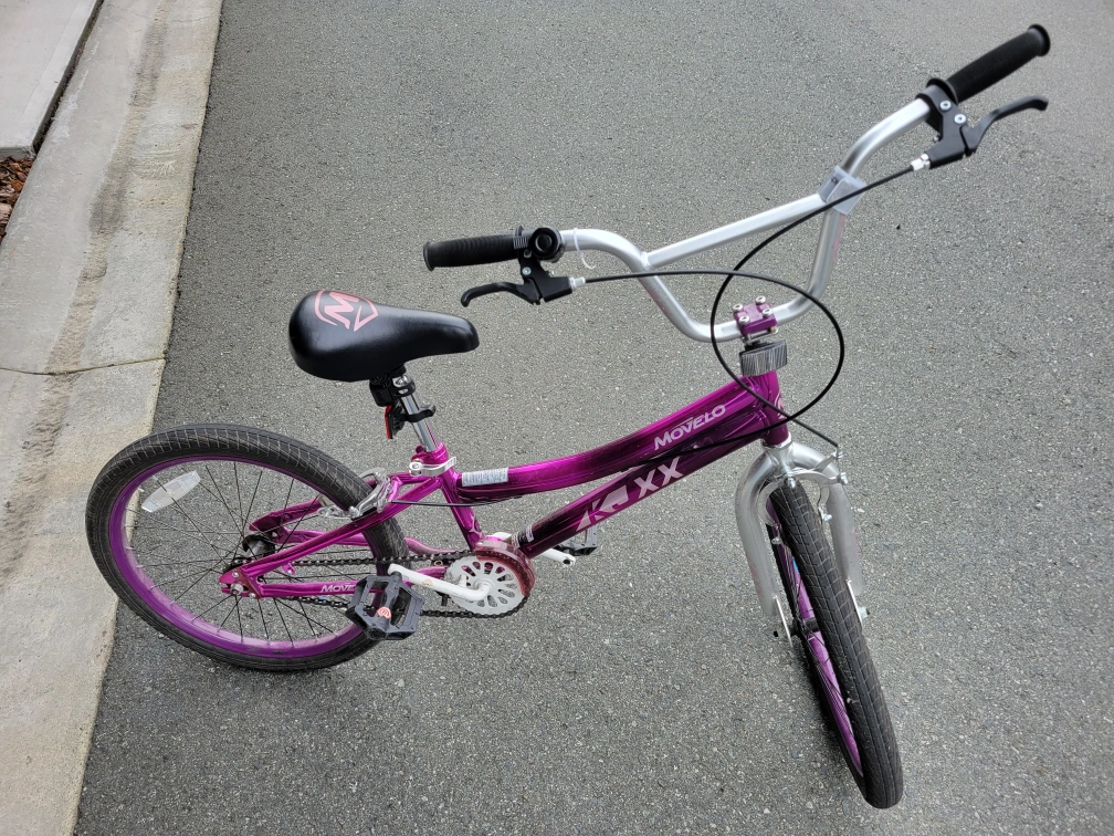 10Purple and silver bike with black seat and handlebars. Comes with bell and kickstand. For children between 6 to 10 years old.