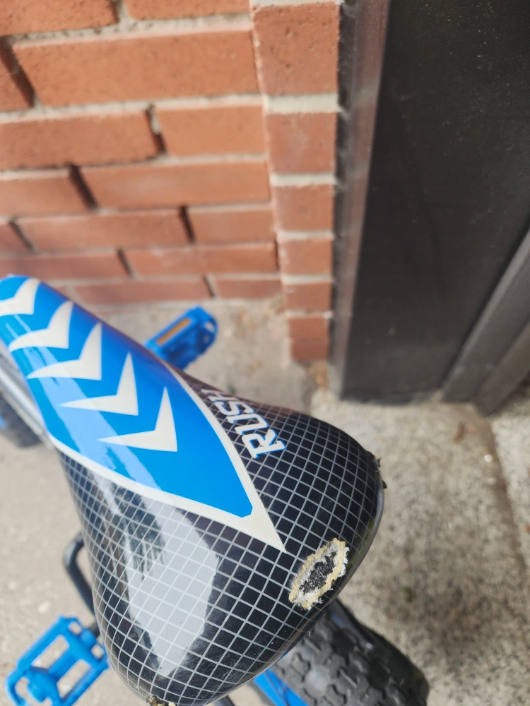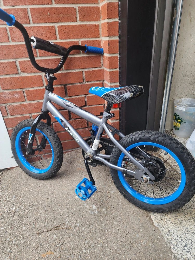 0A blue and silver children's bike. Features a seat with white arrow design. Includes blue pedals and handlebars. Could be perfect for a relaxing ride around the neighbourhood.