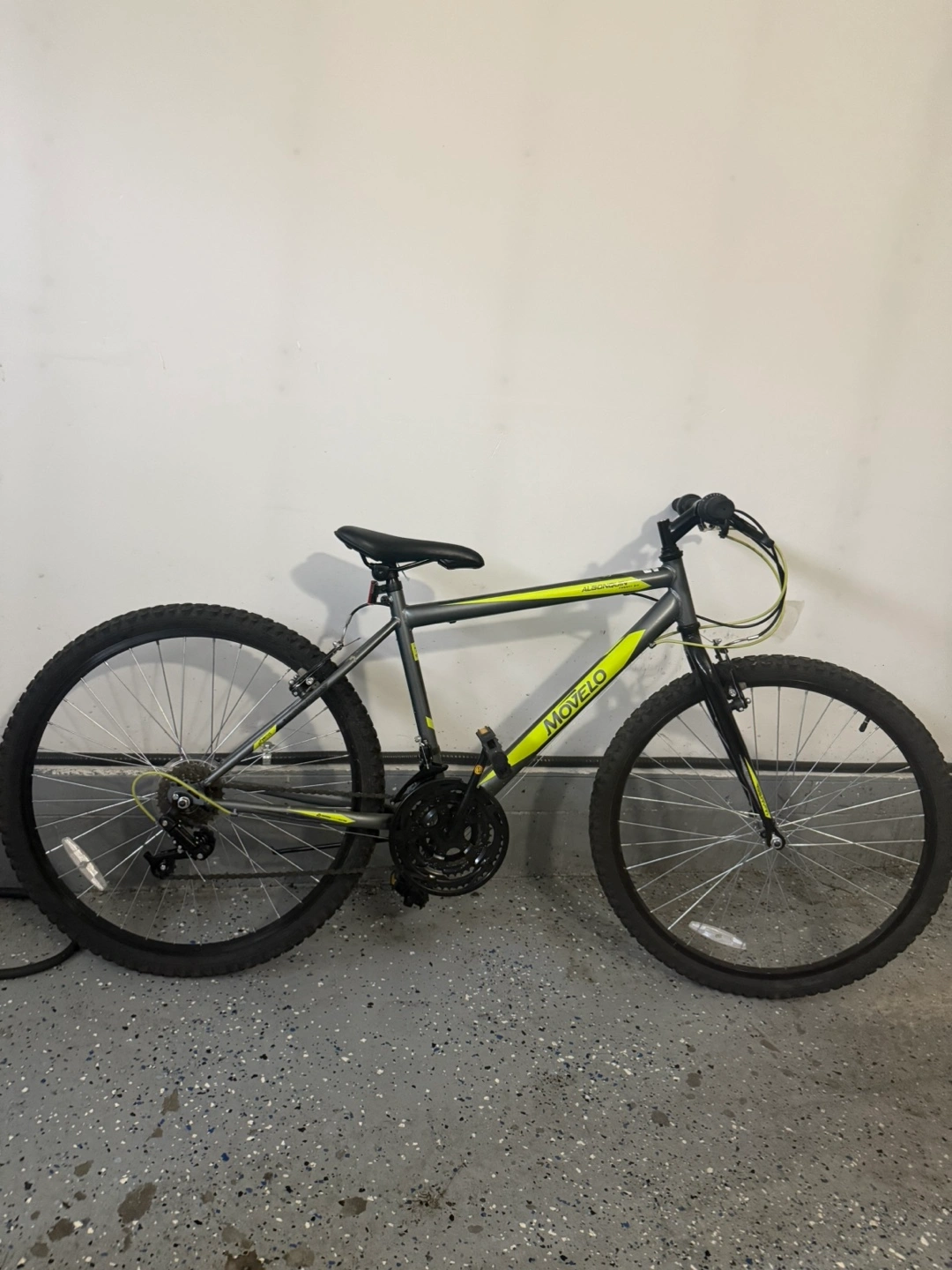 Selling a Movelo mountain bike in a grey and yellow/green colour scheme. It's in good condition and ready for some adventures