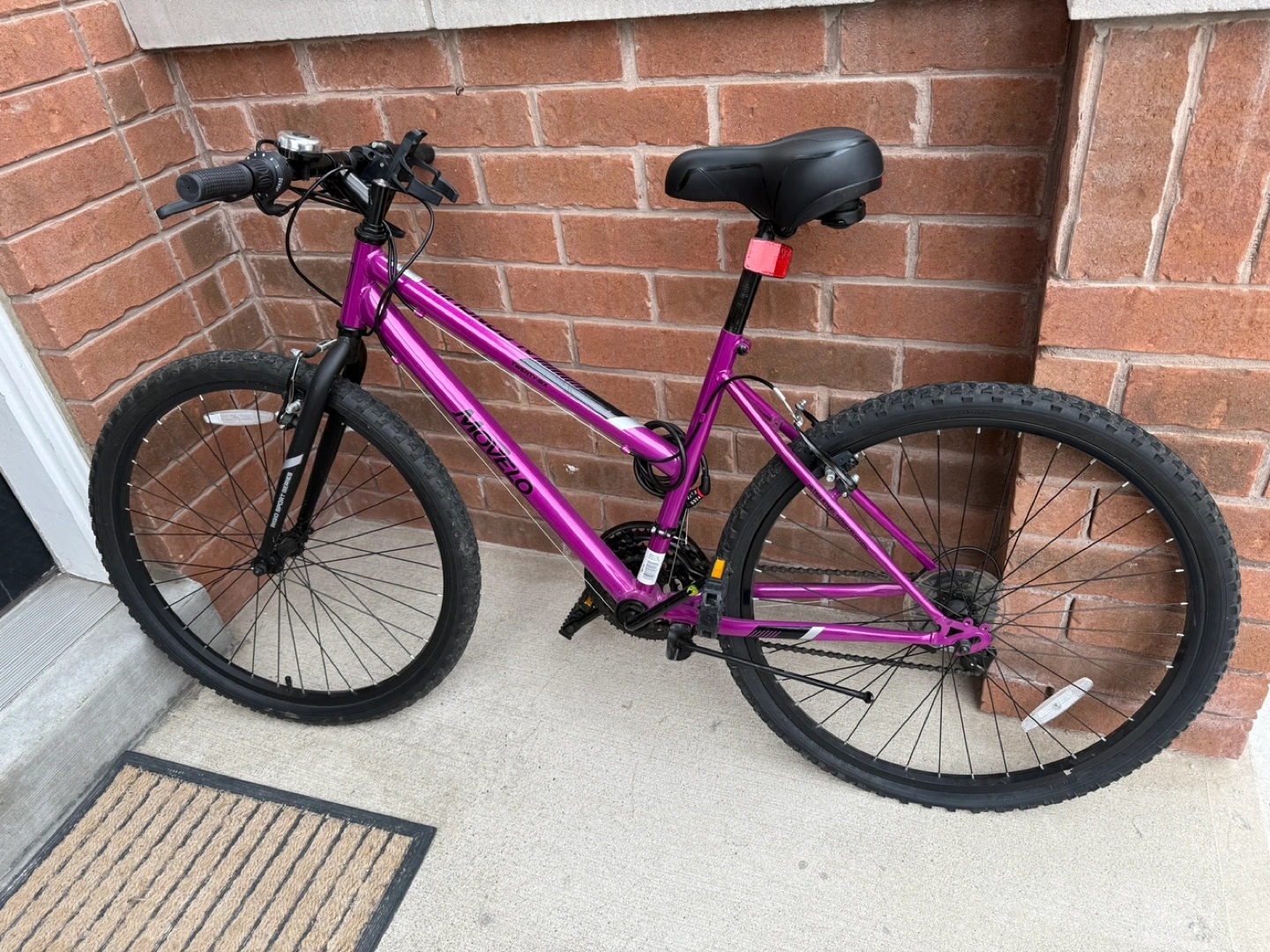 Selling a Movevelo mountain bike in a vibrant purple colour! It's in great shape and ready for some adventures on trails or just cruising around the neighbourhood