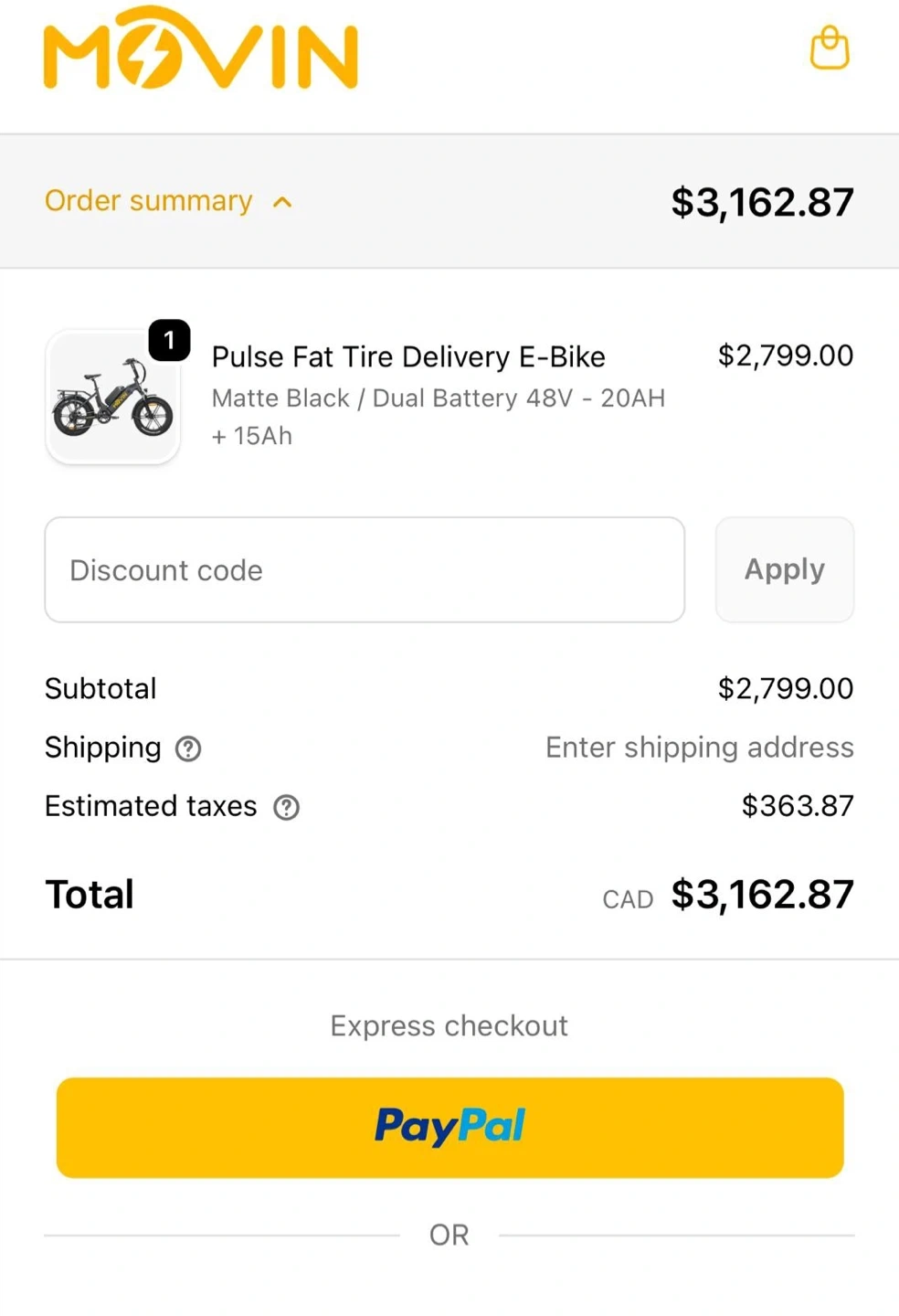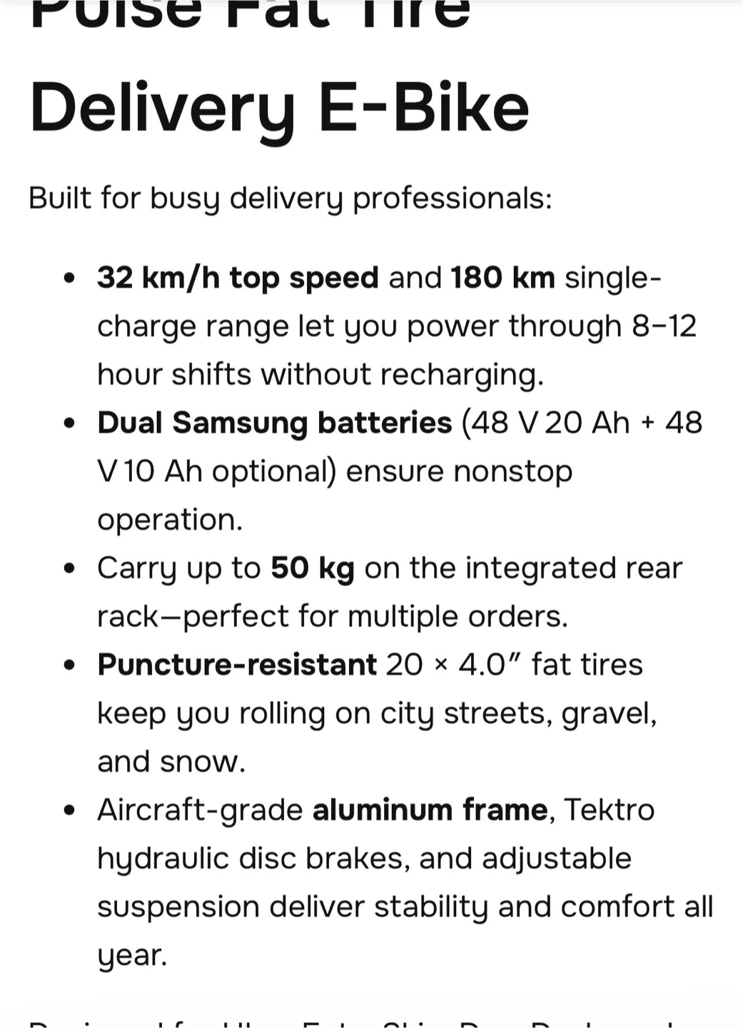Selling a Movin Pulse Fat Tire Delivery E-Bike designed for busy delivery professionals! It features: - Top speed of 32 km/h - 180 km single-charge range - Dual Samsung batteries (48 V 20 Ah + 48 V 10 Ah optional) - Integrated rear rack that can carry up to 50 kg - Puncture-resistant 20 x 4.0" fat tires - Aircraft-grade aluminum frame, Tektro hydraulic disc brakes, and adjustable suspension Originally bought for $3,162.87