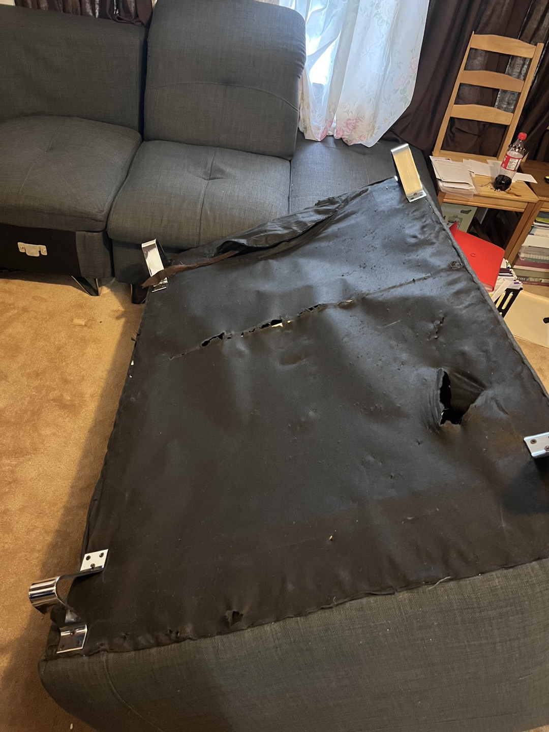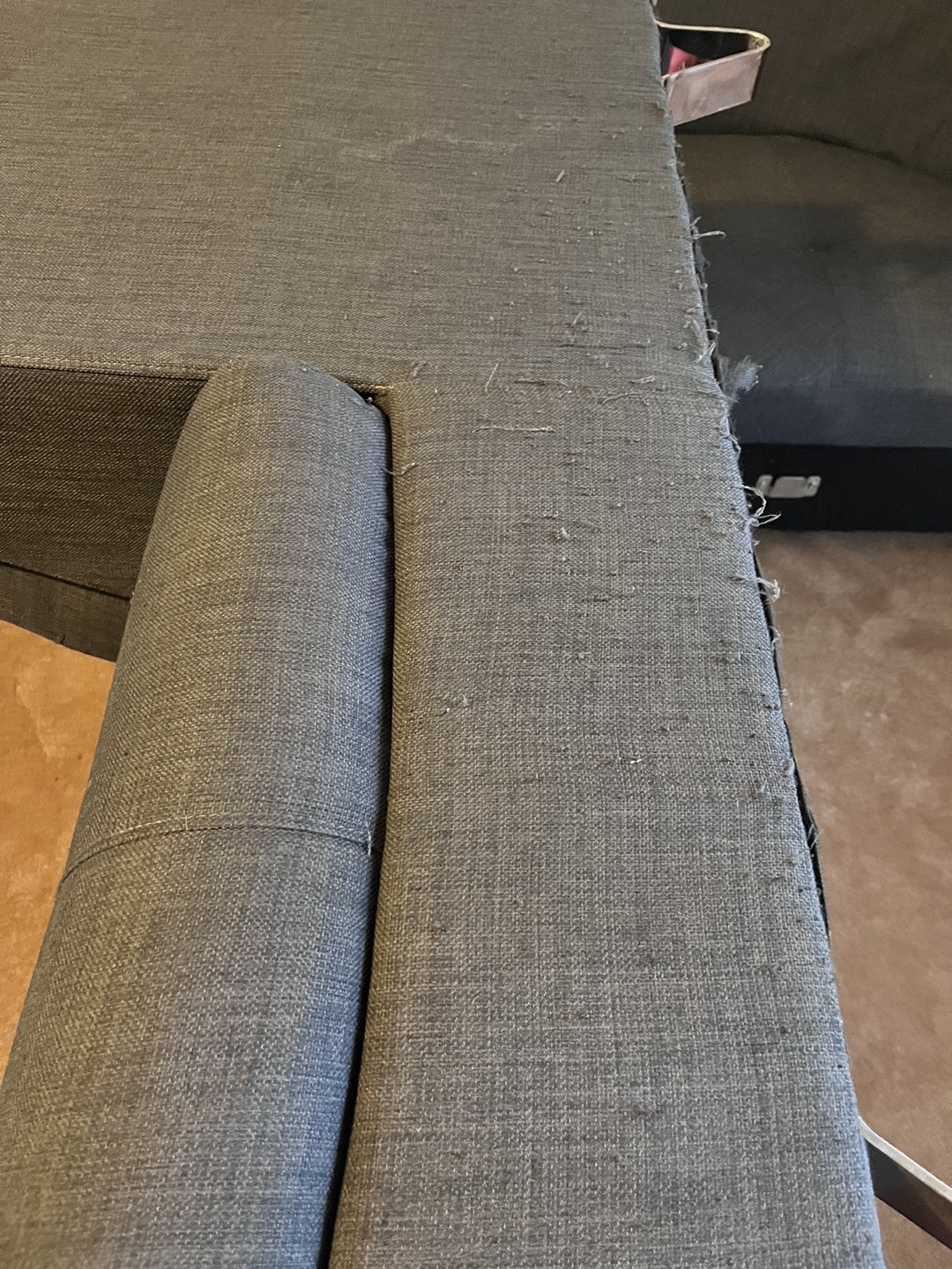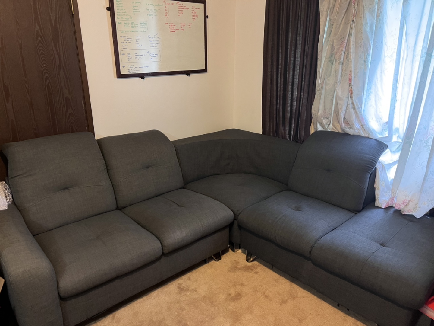 12BLUE COUCH - $200 3 piece sectional couch; Sofa + chaise. Dimensions: 84” x 97” (total; as seen in image) 55.5” x 37” (love seat) 37” x 37” (corner piece) 47” x 37” (chaise piece) Couch is in good condition with exceptions of fabric pleading as shown in photos with normal wear and tear, and torn bottom fabric (easily replaceable). head rests no longer stay up. BOOK CASE ($100/each OR $150 for 2) Mahogany book case w/ 6 shelves Dimensions: 79.5” x 31.5” x 11.25” (H x W x D) Very good condition with little damage to wood. Cases are leaning forward slightly as they are a few years old but have held quite a bit of weight regardless. 1 book case backing has slid down but could easily be glued back into place (as shown in 2nd photo) BOOK SHELF - $30 Mahogany, open back design bookshelf Dimensions: 26” x 27.5” x 10” (H x W x D) Good condition. Damage to corner of wood on shelves and the finishing along the top shelf. Slight wobble but overall still sturdy. COFFEE / SIDE TABLE - $20 Simple wood coffee / side table with glass top. Very good condition with small marker stain on the inside, under the bottom shelf. Dimensions: 16” x 17.75” x 14” (H x W x D) . . . I do not have a truck so you must be able to transport. I’m available Sundays and some Wednesday's. *all measurements are approximate to the tenth decimal place; rounded up to be safe.