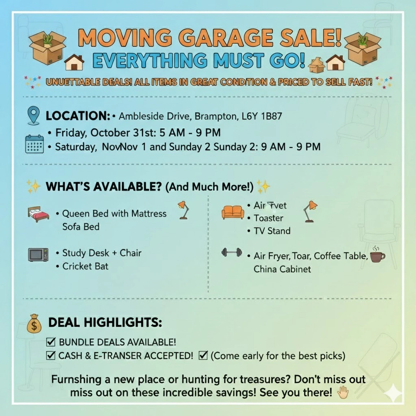 68🏡 Moving Garage Sale – Everything Must Go! 📍 Location: Ambleside Drive, Brampton, L6Y 1B7 🗓️ Date: October 31st, November 1st and November 2nd. 🕘 Time: 5pm to 9pm on Friday October 31st and 9am to 9pm on Saturday and Sunday I’m moving out and clearing the house—tons of great items at unbeatable prices! Everything is in great condition and priced to sell fast. Come early for the best picks! --- 🔹 What’s Available: • Queen bed with mattress • Sofa bed • Study desk + chair • TV stand, chairs, carpet • Microwave, ring light • Office chair, shoe rack • Cricket bat • Air fryer, toaster, coffee table, China cabinet …… and much more! 🎯 Bundle deals available 💬 Prices negotiable 🚗 Cash & e-transfer accepted 📦 First come, first served Whether you’re furnishing a new place or hunting for deals, this is your chance to score big before I move out!