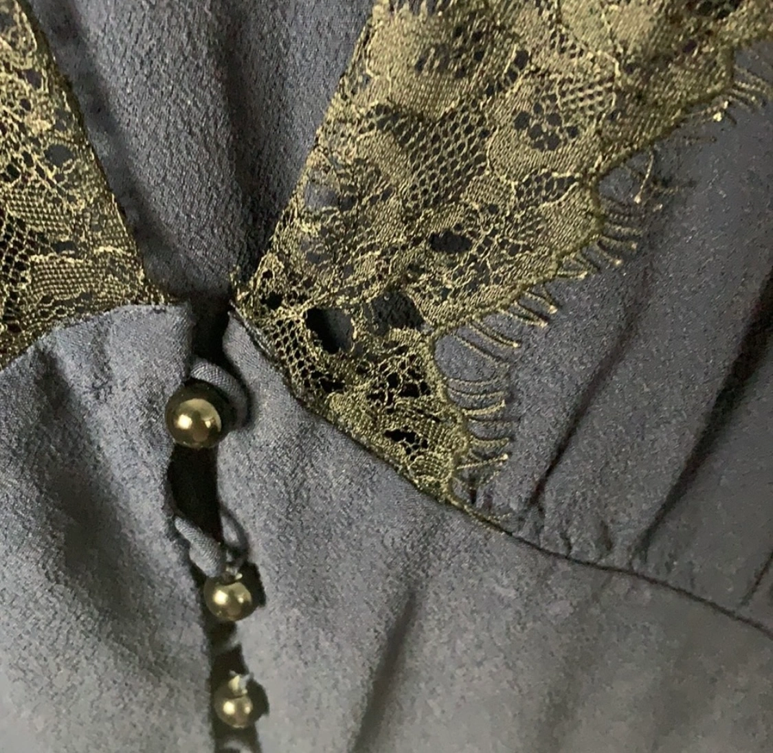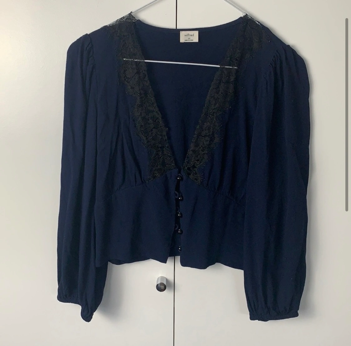 Navy blue blouse with black lace detailing. Long sleeves with button closure in the front. Small hole in bottom lace however not noticeable when blouse is worn. Moving sale- bundle with two other items for $20 total.