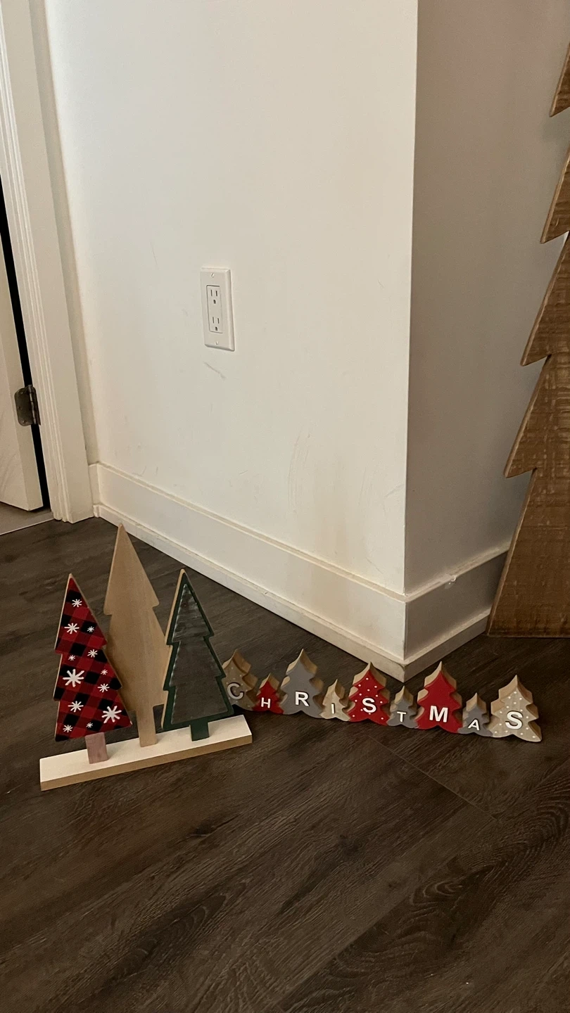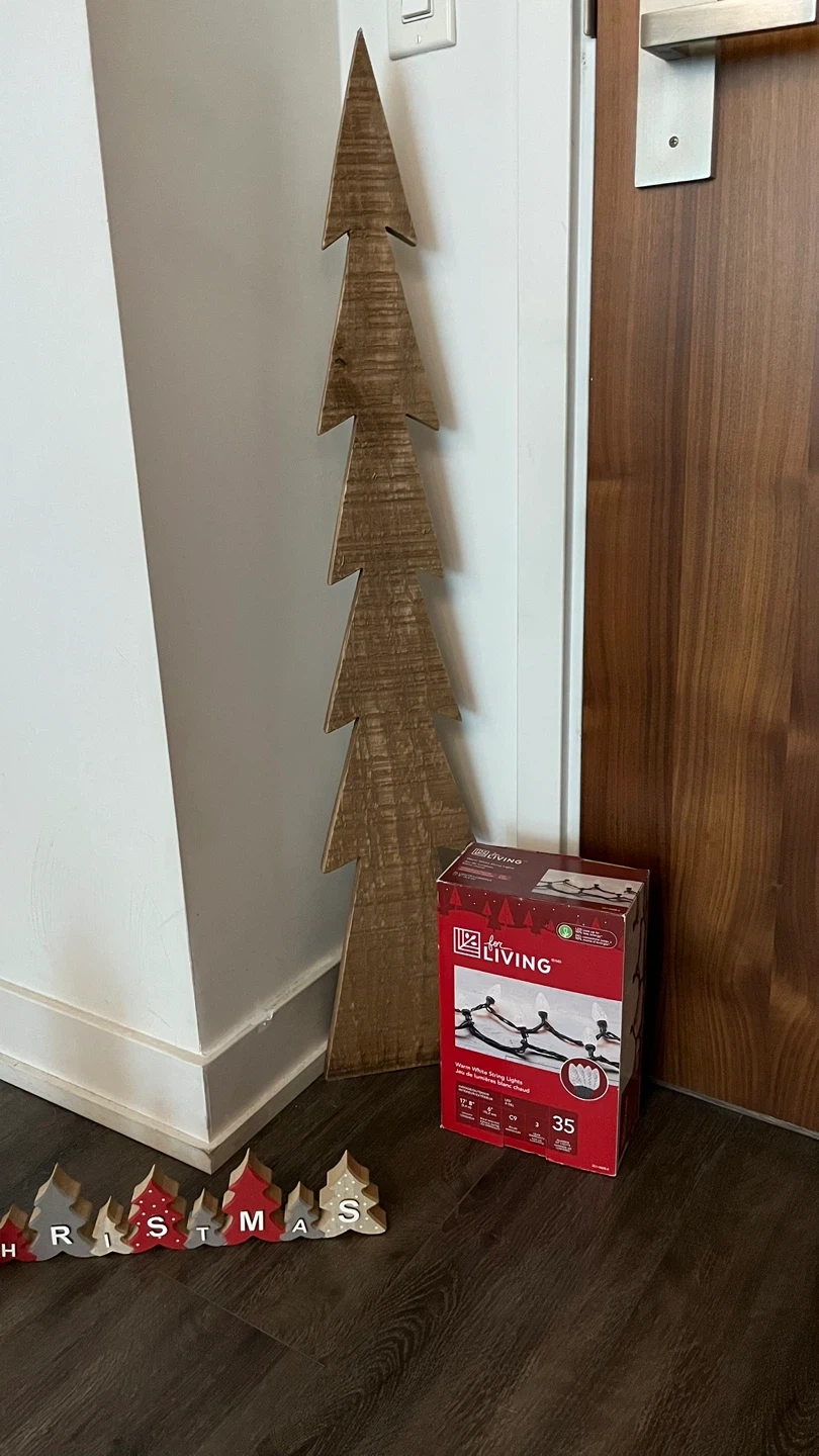 Selling a cute set of Christmas decorations! Includes a tall wooden tree, a string of 35 Living string lights, and a set of small wooden Christmas trees. 🎄🎁❄️
