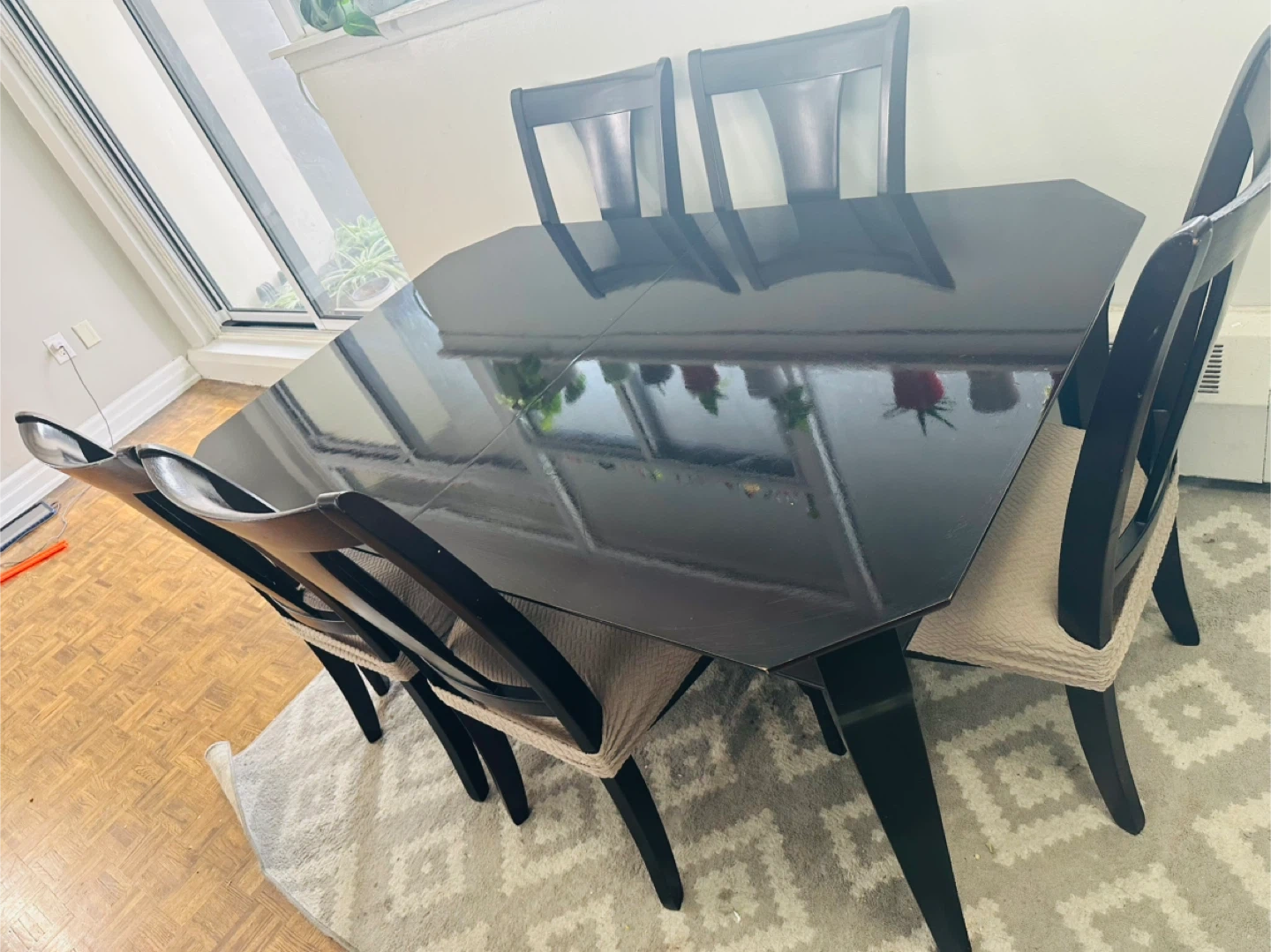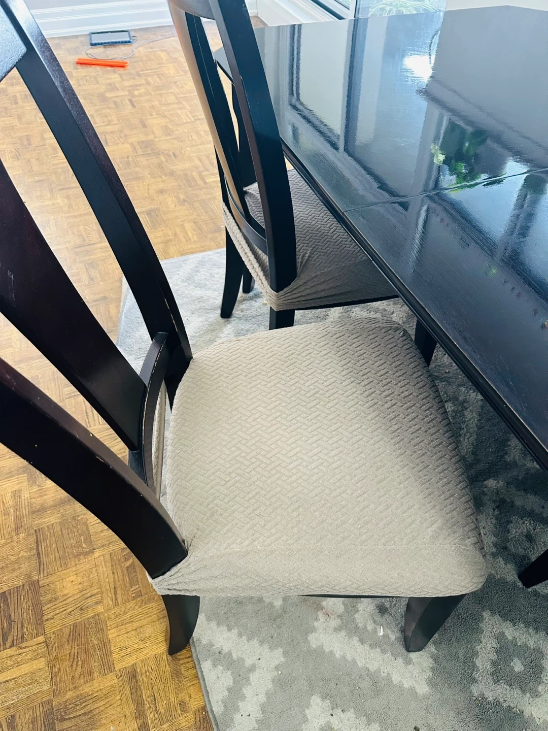 This dark wood dining table comes with five chairs and is perfect for a family or anyone who loves to entertain. It's sturdy and has a beautiful, classic look. The table has a smooth surface . It's in good condition, ready to enhance your dining experience. Some minor wear and tear, as it is a used . 6 Seat covers included 64* 42 inches