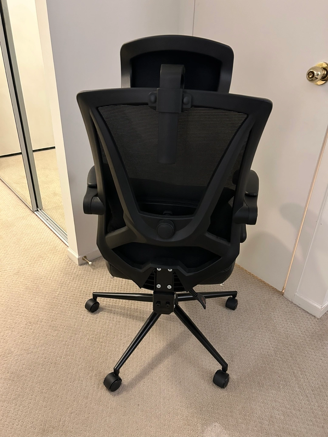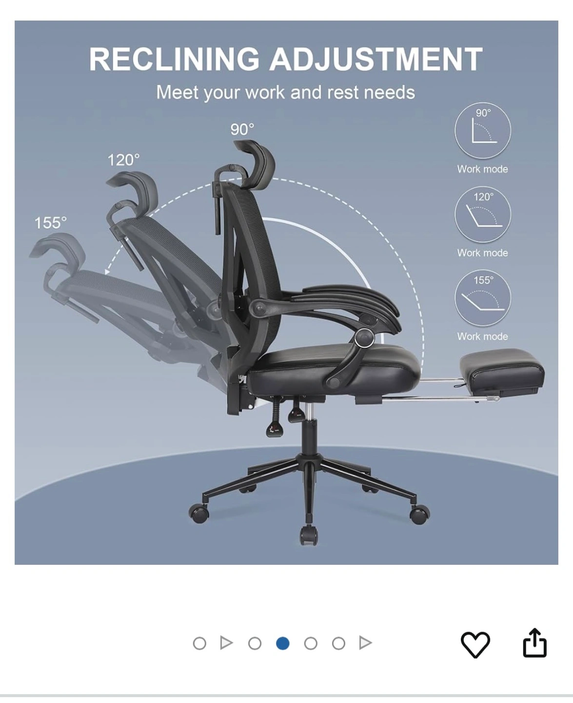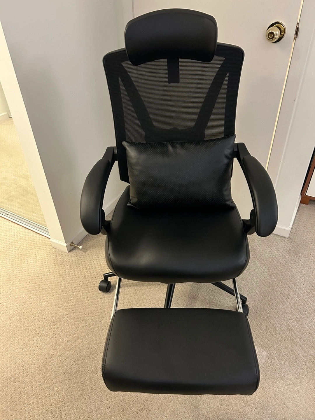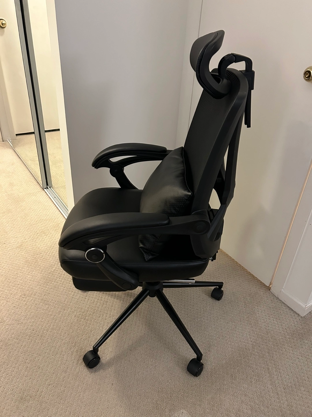 51Moving sale. Condition: Like New High-back ergonomic office chair. Features adjustable headrest, lumbar support, and footrest. Mesh backrest and padded leather seat. Black colour. Excellent condition. *Get it only for $100 with a black cushion