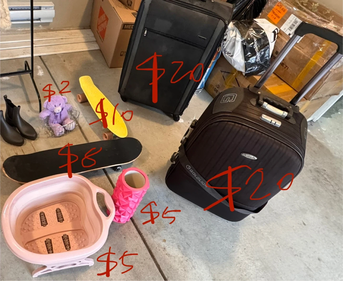 10Selling a mix of brand new and used household items at a low price. π²**$65 for the entire set**, or items can be sold separately (prices negotiable). Available for one week only! π Pick-up at Burnaby Hospital Includes: π Cotton swab box (brand new) π Photo frame (brand new) π Foam roller (brand new) Used foldable foot bath Used skateboard Used suitcase Great deal for a quick sale!