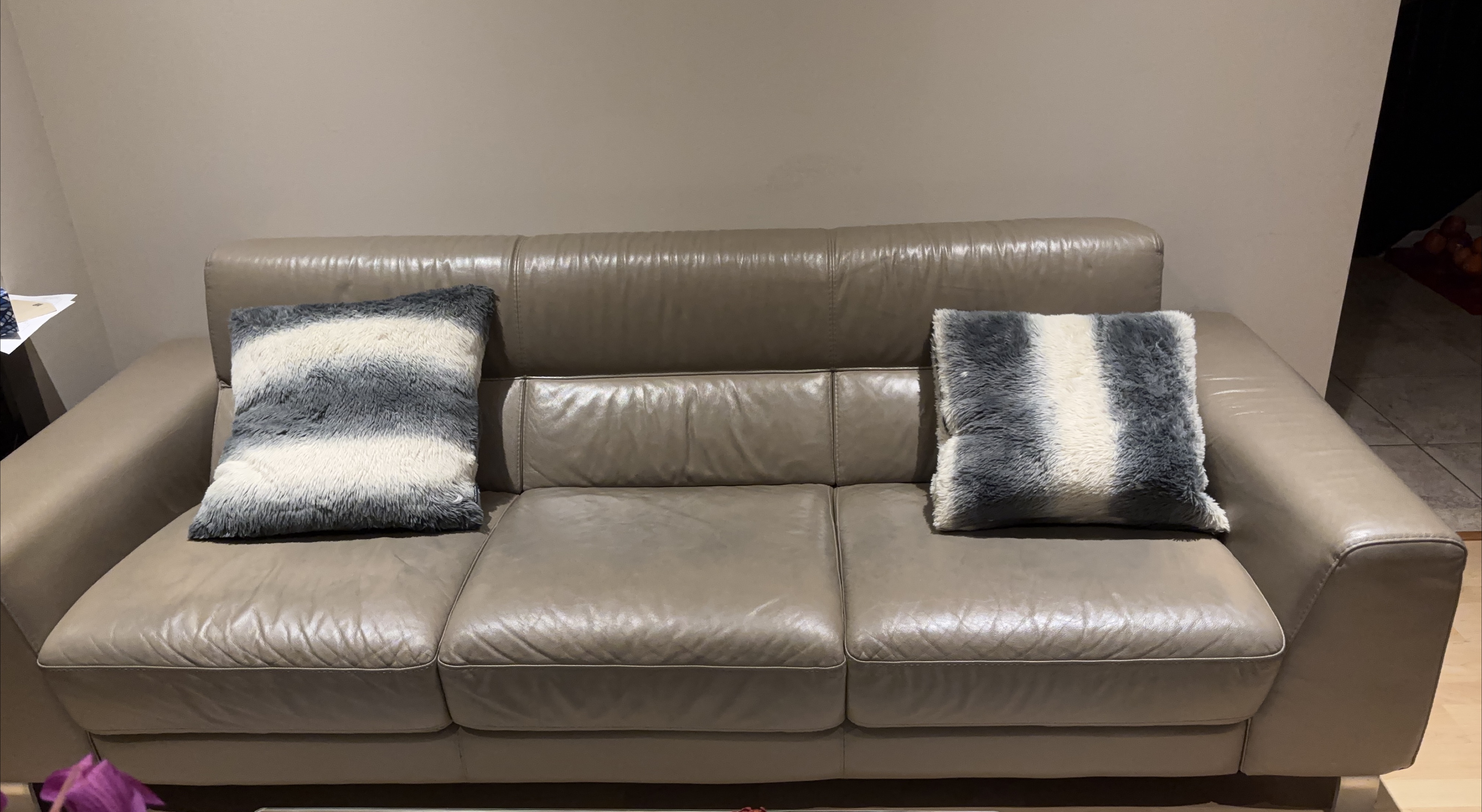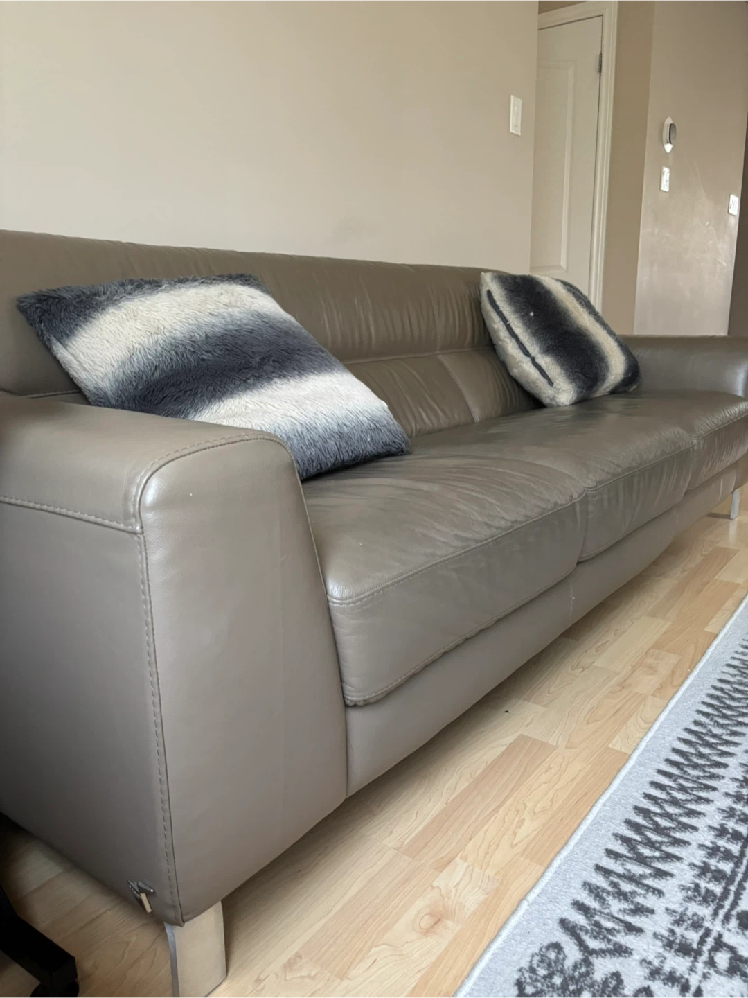 Selling a comfy Calia Italia leather sofa in a neutral taupe colour! It's in good condition and would look great in any living room. Perfect for relaxing after a long day or entertaining guests. The pillows are included!