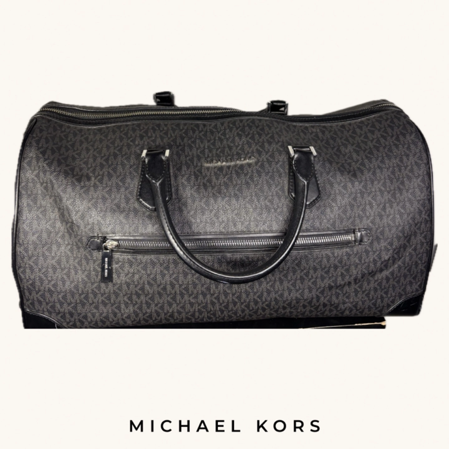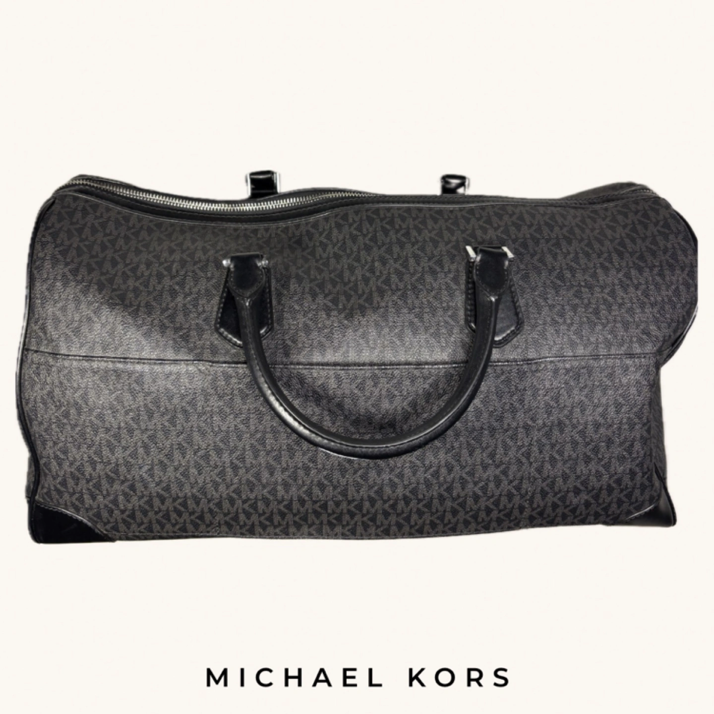 366Large black duffle bag. Michael Kors monogram print. * Black leather accents * Includes a removable shoulder strap and suitcase strap on rear side * Great for travel! Pickup Only - Toronto, near Exhibition MOVING SALE - Looking to sell ASAP