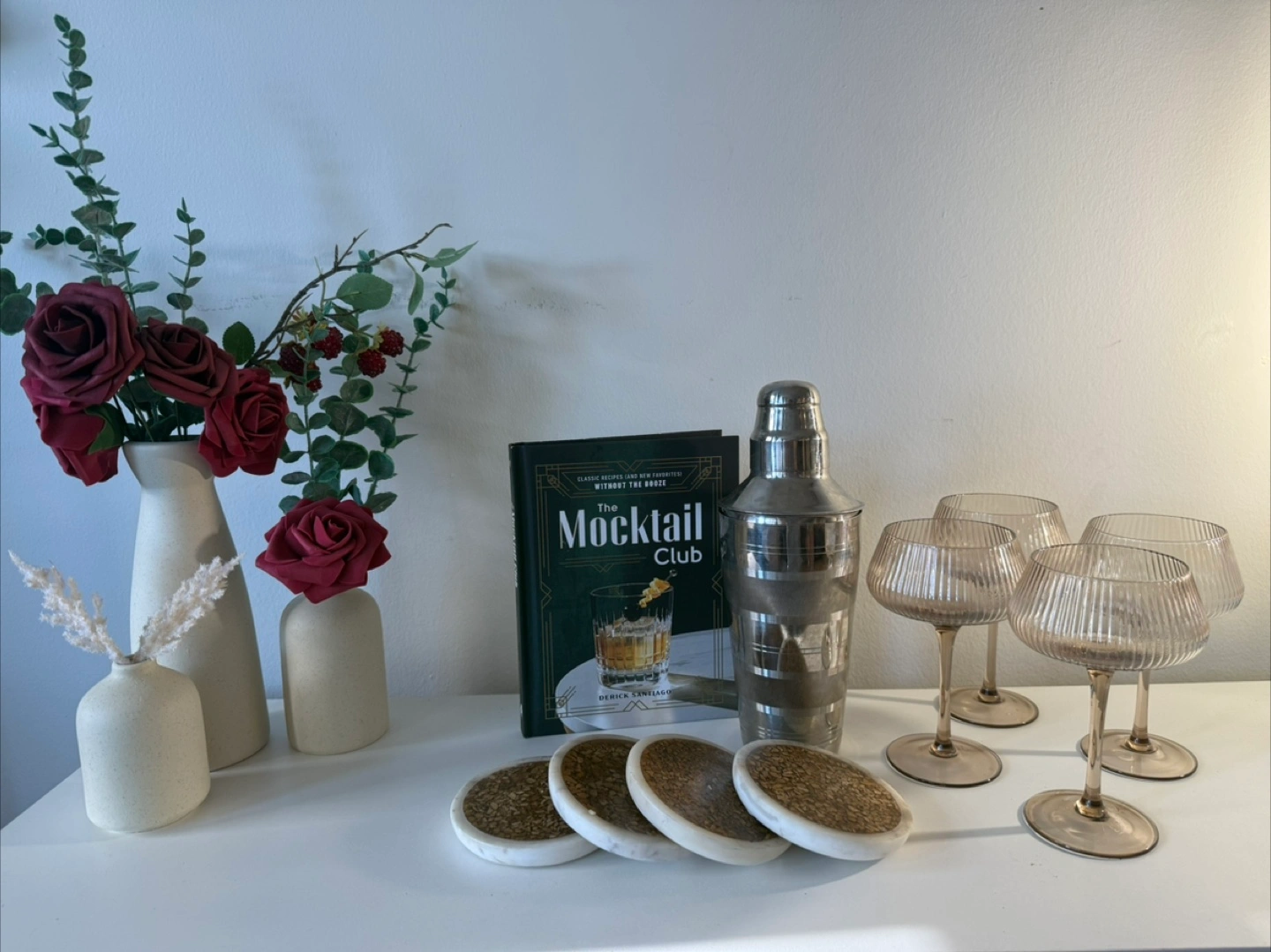Selling a collection of barware and accessories! Included is the 'Mocktail Club' book, a cocktail shaker, (four coasters were sold separately), and four stemmed glasses. Perfect for creating fun and fancy non-alcoholic drinks at home or alcoholic 😉