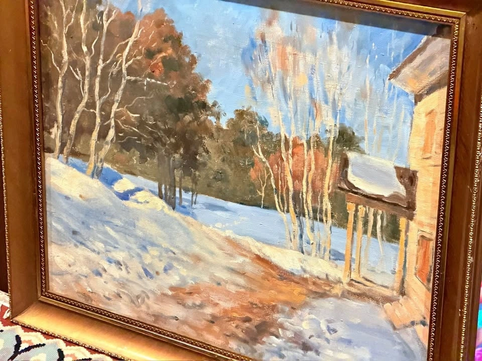 60Framed winter landscape oil painting featuring a serene snowy hillside, birch trees, and a rustic building bathed in soft natural light. Warm tones and detailed brushwork create a peaceful, atmospheric scene perfect for traditional or cozy home décor. 71cm *62cm