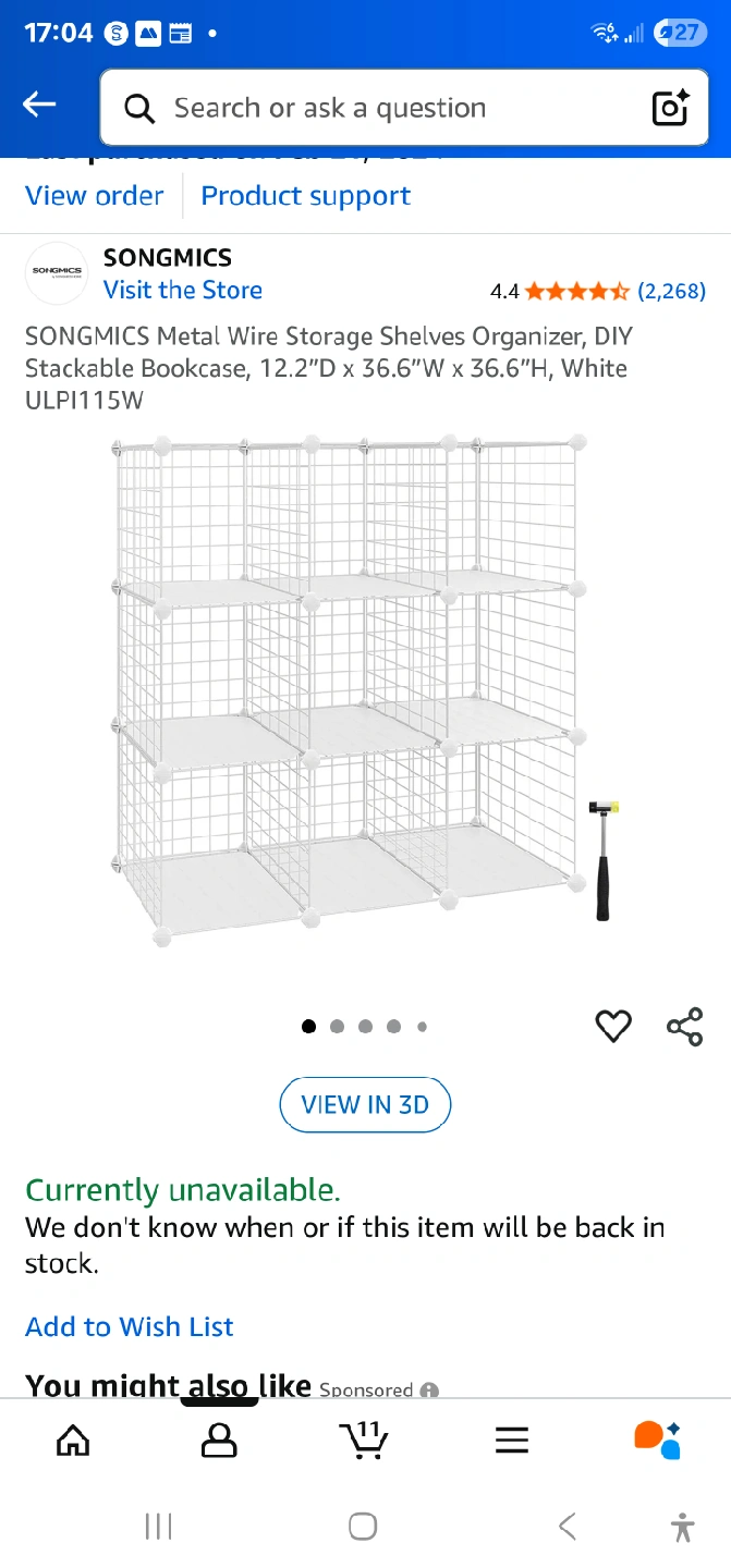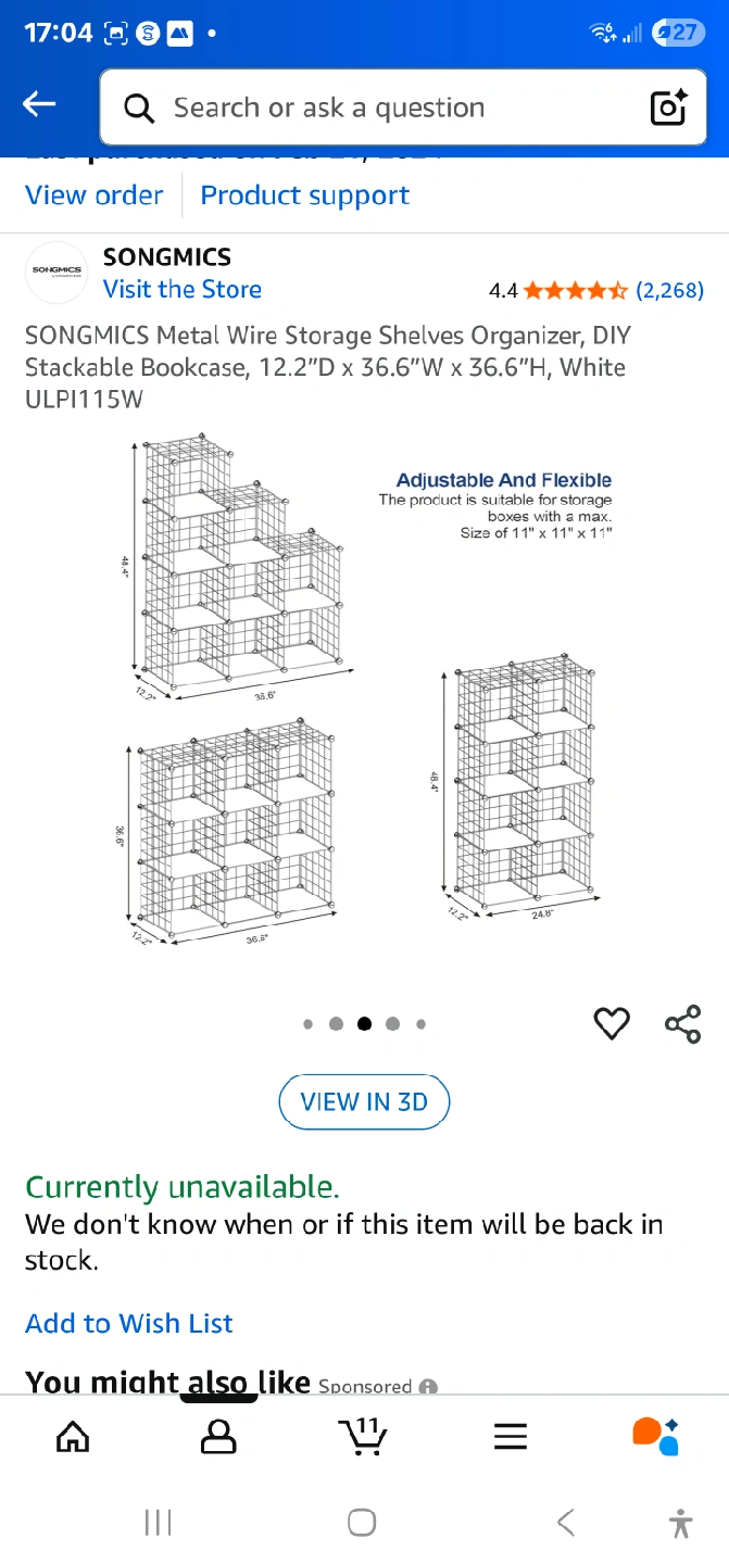 This is a SONGMICS metal wire storage shelves organizer. It's a DIY stackable bookcase in white. The dimensions are 12.2"D x 36.6"W x 36.6"H. The model number is ULPI115W. It is adjustable and flexible and suitable for storage boxes with a max size of 11" x 11" x 11"