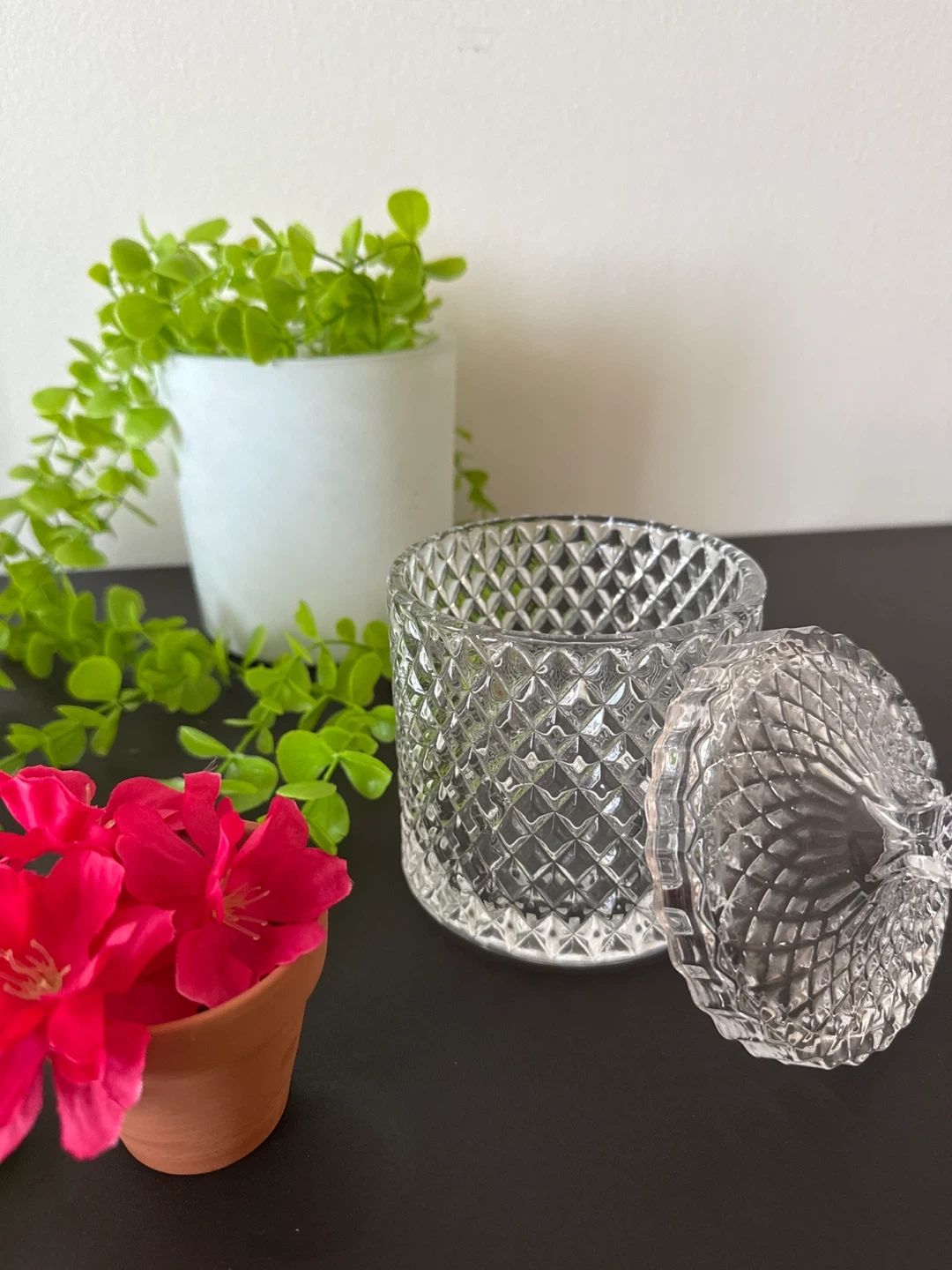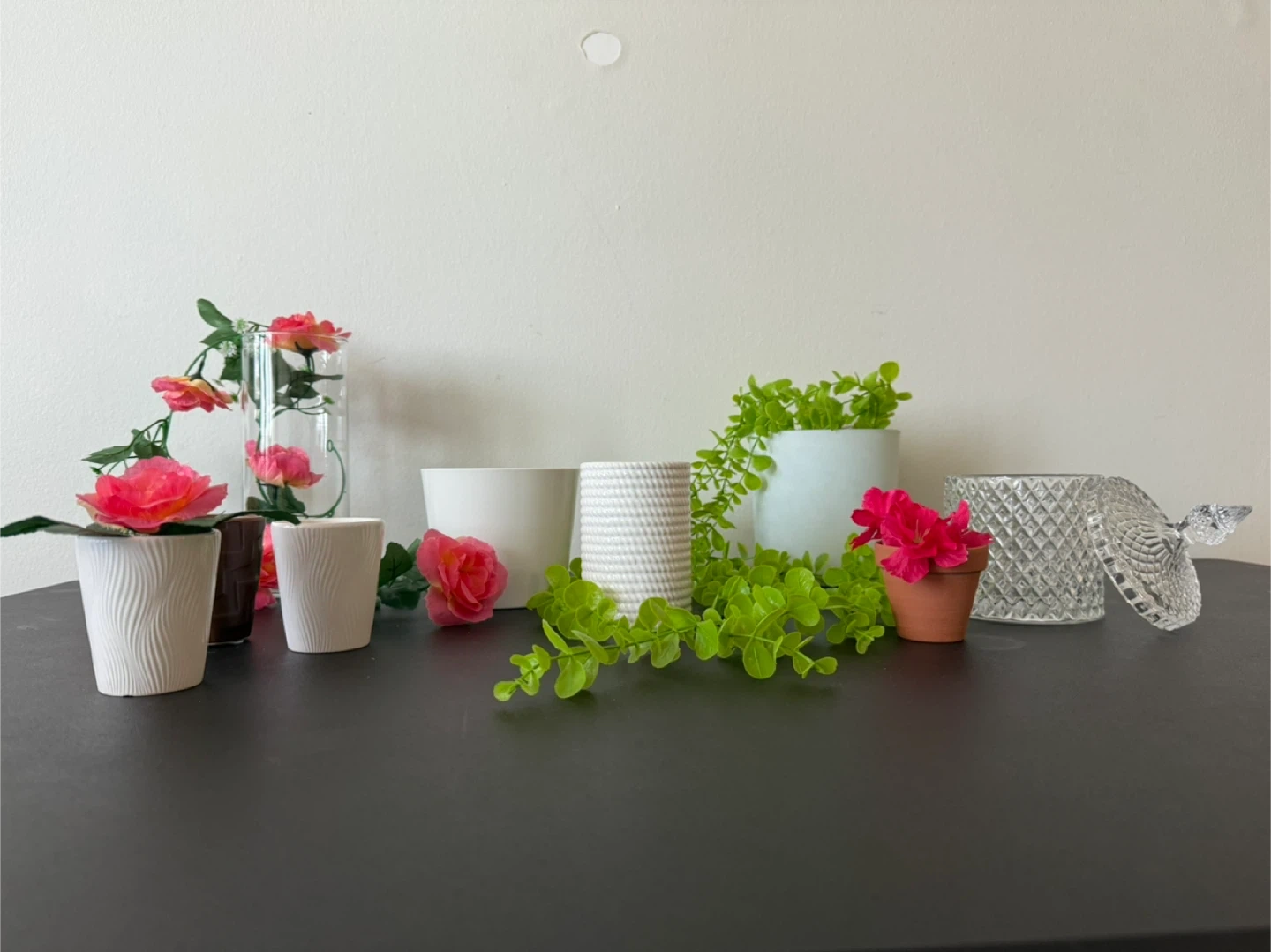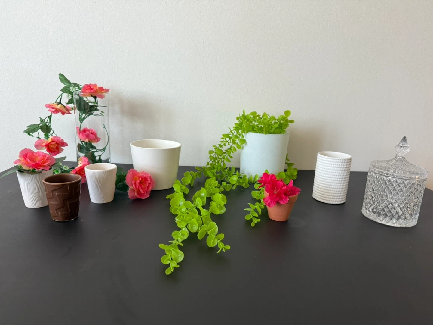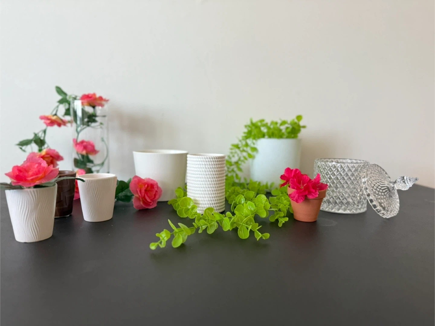 Selling a selection of white ceramic plant pots, a glass vase, and a candy container. They come in various shapes and textures, perfect for adding a touch of greenery to your home. Great for small plants or succulents. Fake flowers can be added.