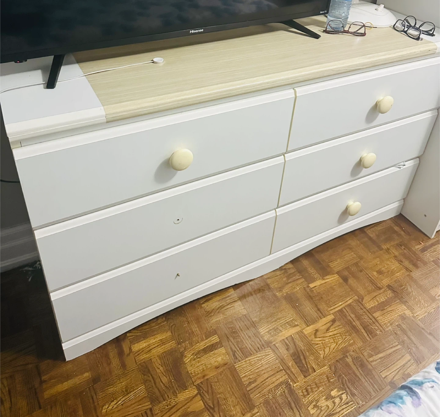 44Selling a white dresser with six drawers. It's in good condition and would be great for extra storage in a bedroom or closet! There are some minor signs of wear, as shown in the photos. Some wood chipped off on the top ( covered under the wooden coloured wallpaper) . 2 knobs available , the screws are missing . Smoke free pet free home