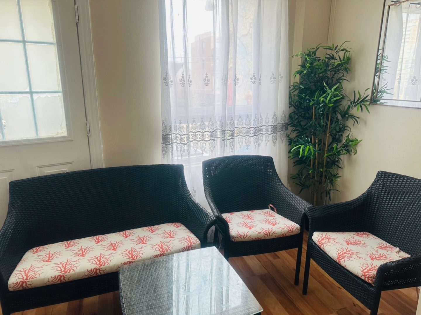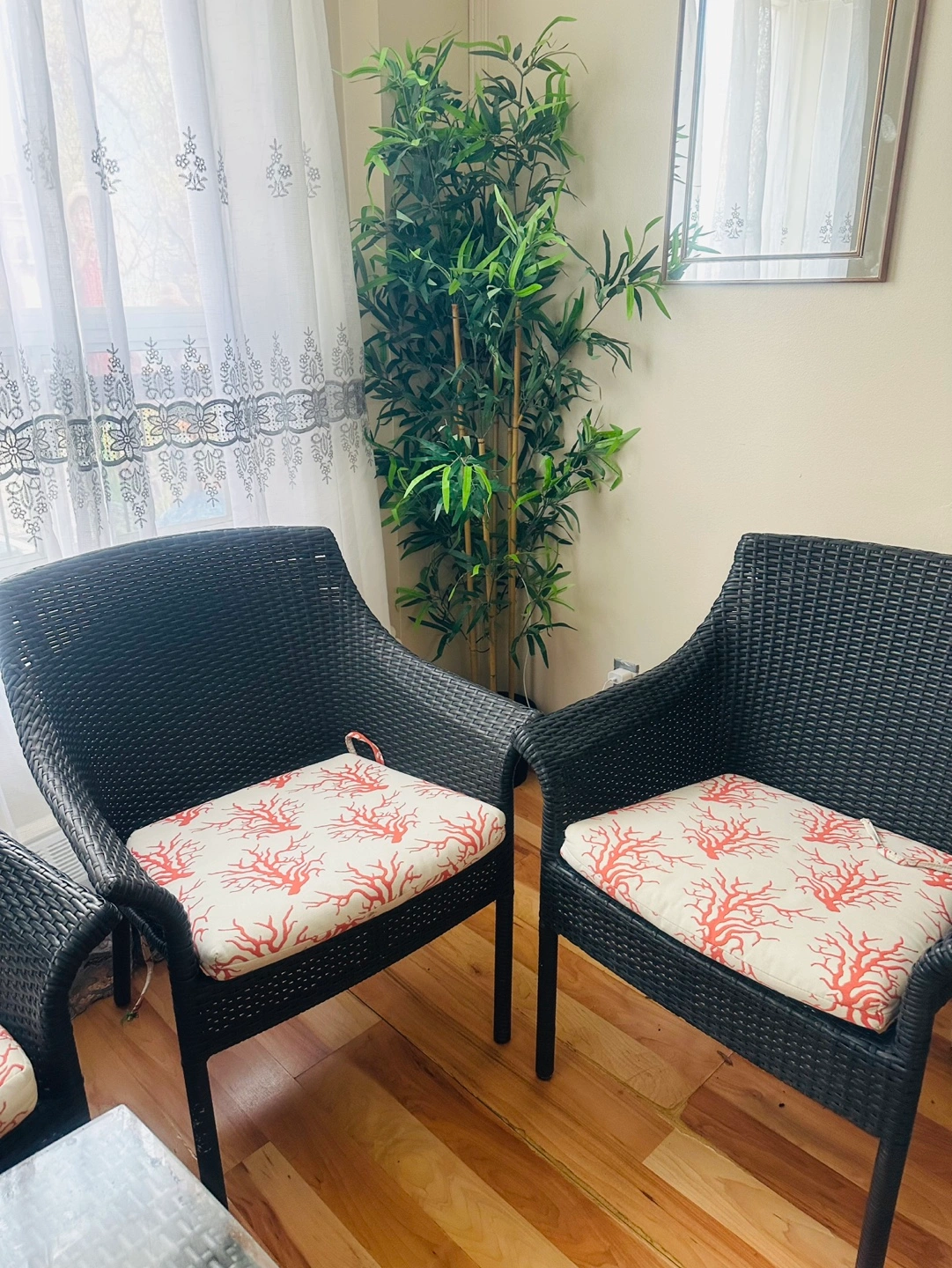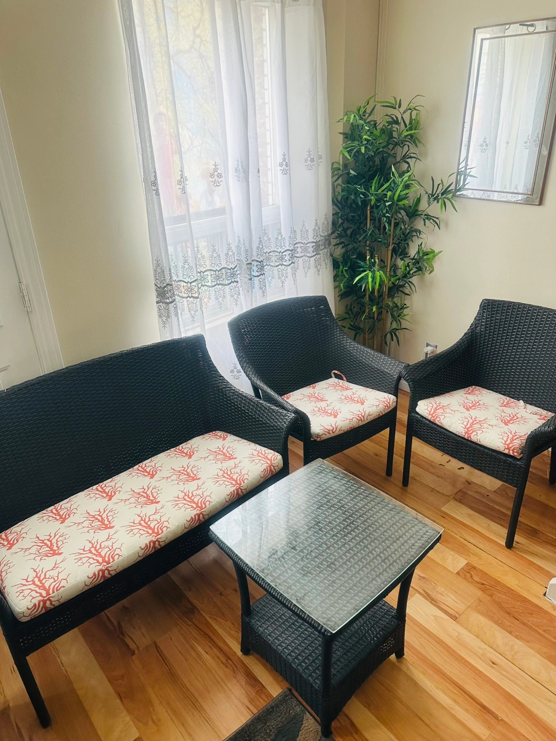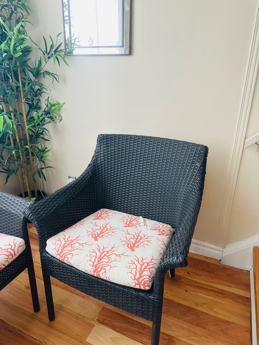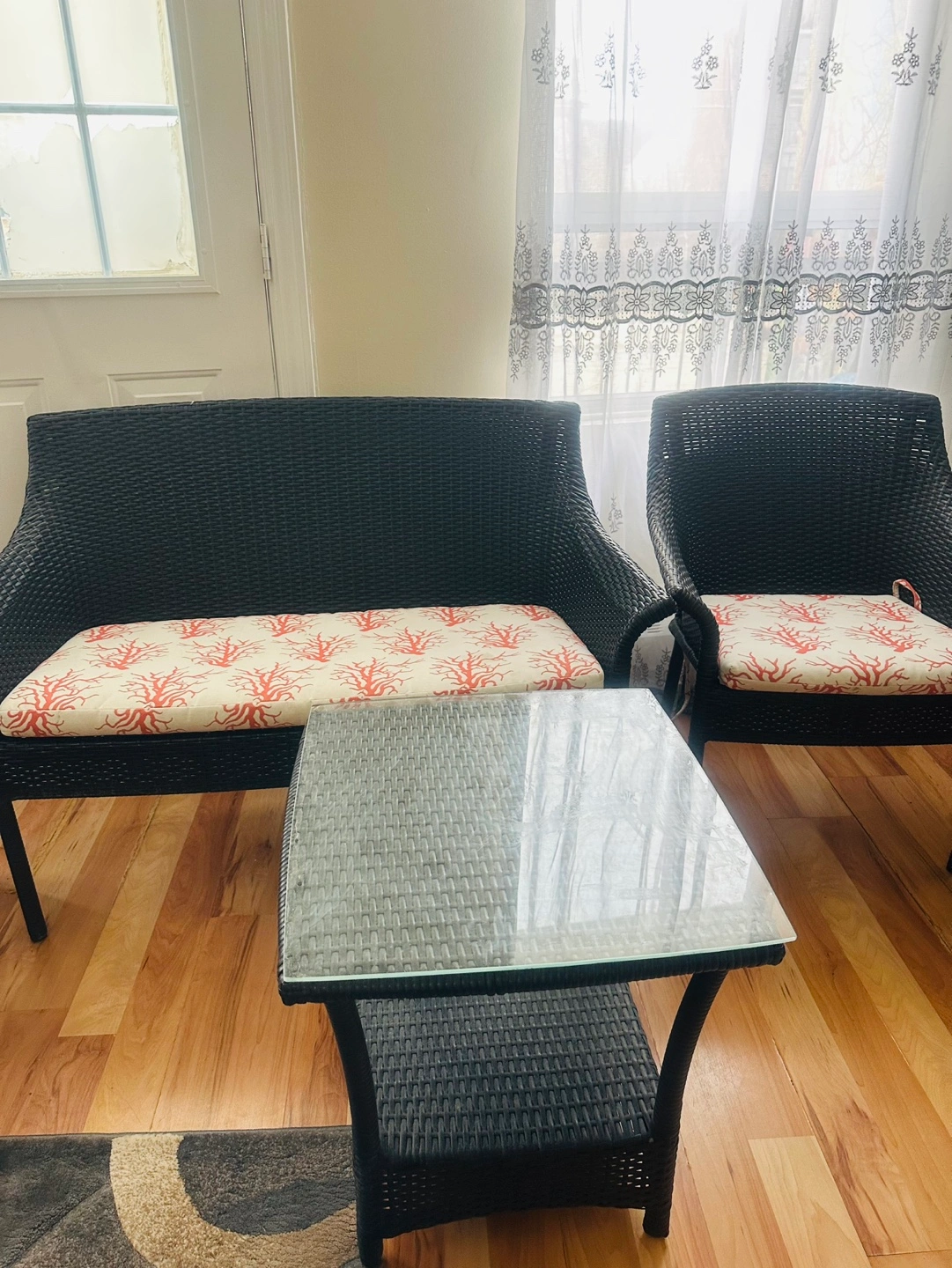 363Black wicker patio set including a loveseat, two armchairs, and a table with a removable glass top. Coral-patterned cushions are included.